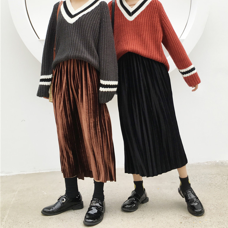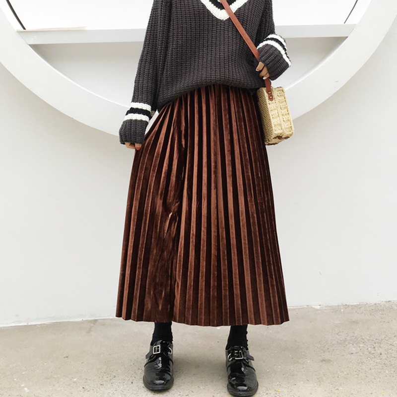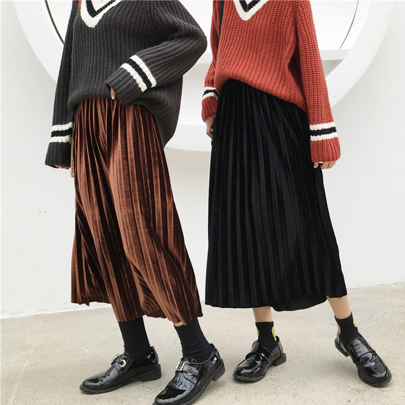復古絲絨百褶裙秋裝女2018新款韓版高腰顯瘦中長裙學生A字半身裙