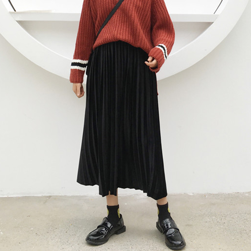 / 復古絲絨百褶裙秋裝女2018新款韓版高腰顯瘦中長裙學生A字半身裙