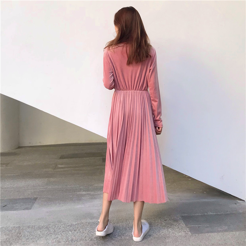 法式少女桔梗裙秋冬裝2018新款eeg中長裙時尚百搭收腰百褶連衣裙