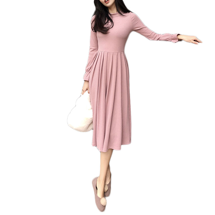 秋裝女2018新款氣質時尚純色高腰顯瘦大擺裙韓版修身長袖連衣裙潮