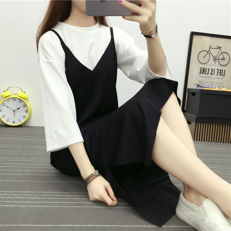 / 時尚兩件套秋裝女2018新款開叉吊帶打底連衣裙子寬松圓領上衣T恤