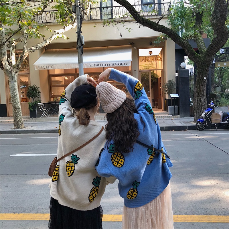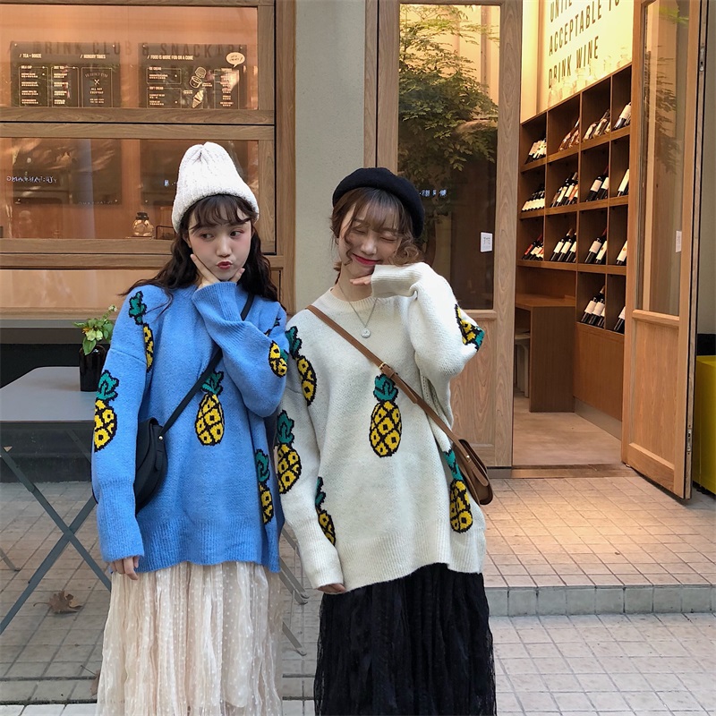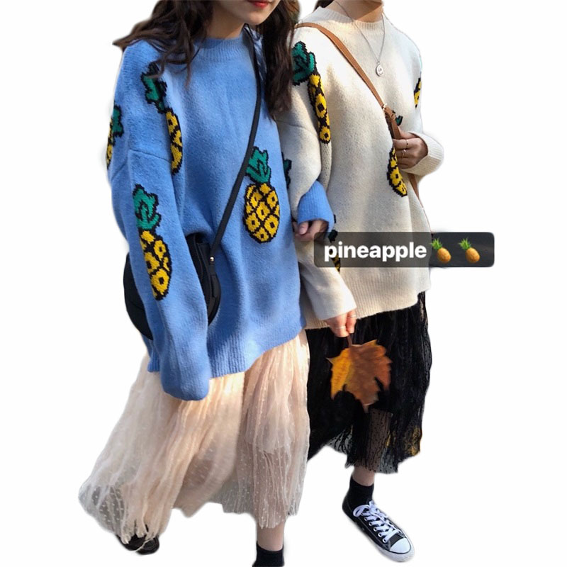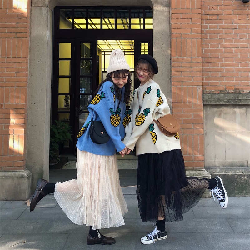/ 韓版寬松圓領長袖套頭菠蘿毛衣女+高腰網紗百褶半身裙時尚套裝潮
