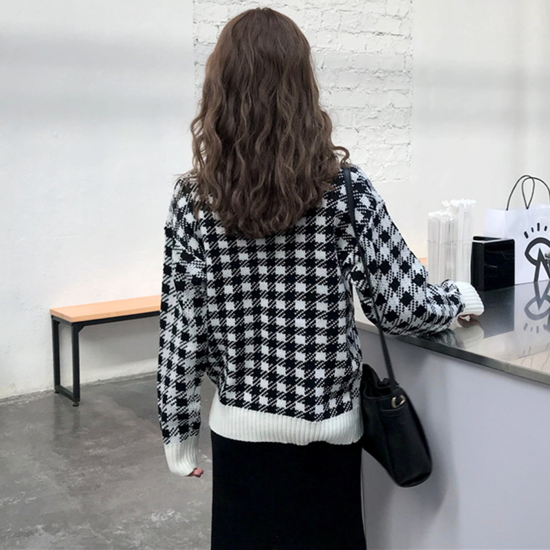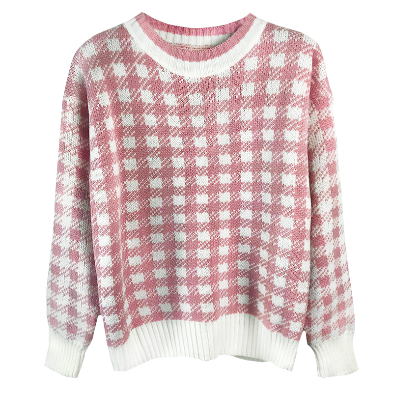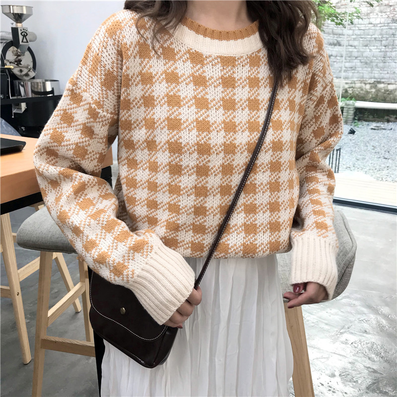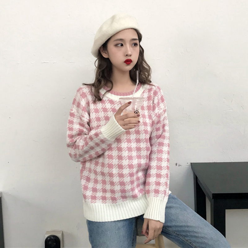 / 學院風慵懶套頭針織打底衫女寬松格子套頭毛衣秋裝新款長袖上衣潮