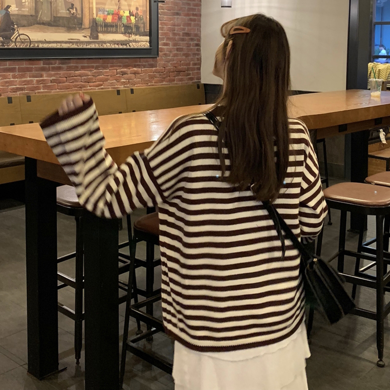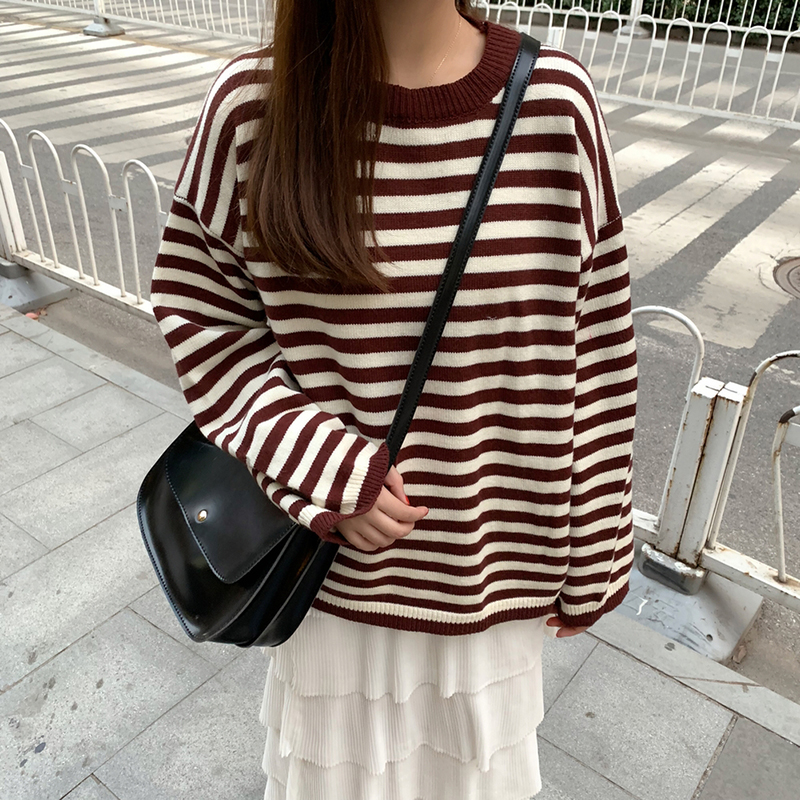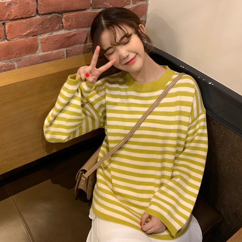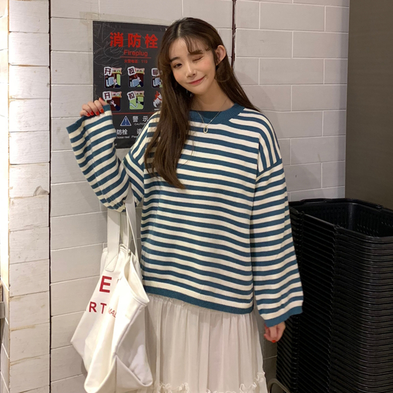 秋冬女裝2018新款chic風百搭條紋套頭針織衫學生寬松長袖毛衣外套