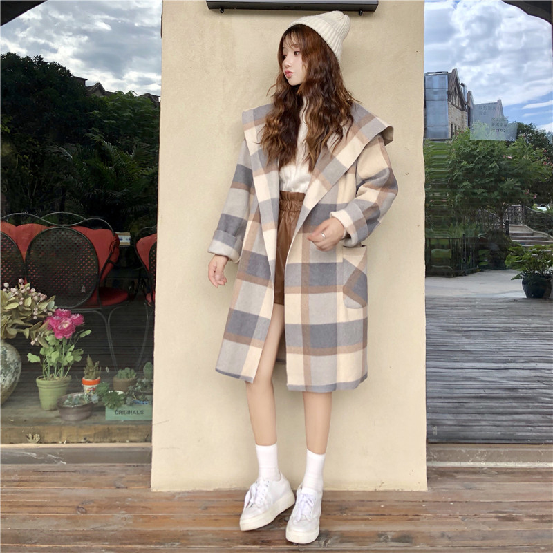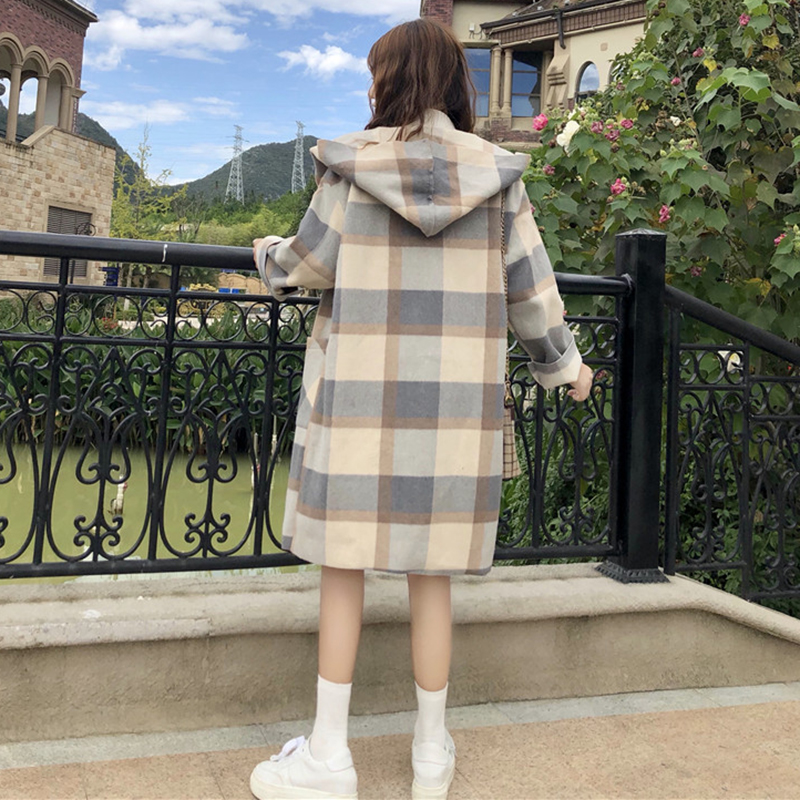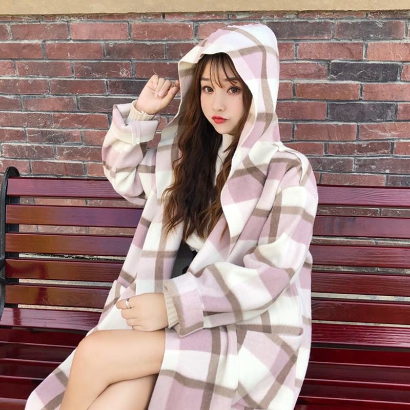 / 連帽大衣秋冬女裝2018流行新款學生寬松中長款雙口袋格子毛呢外套