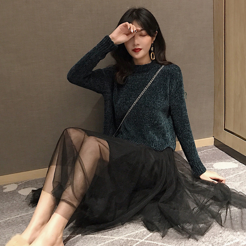 / 毛衣配裙子兩件套女秋裝新款不規則慵懶針織衫高腰顯瘦網紗半身裙