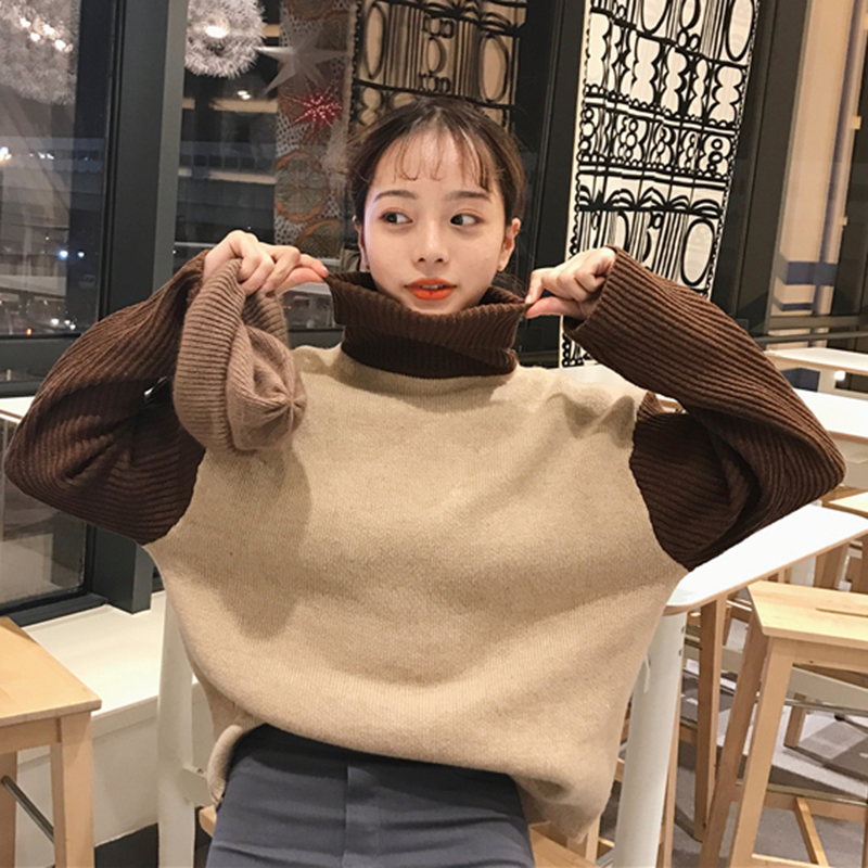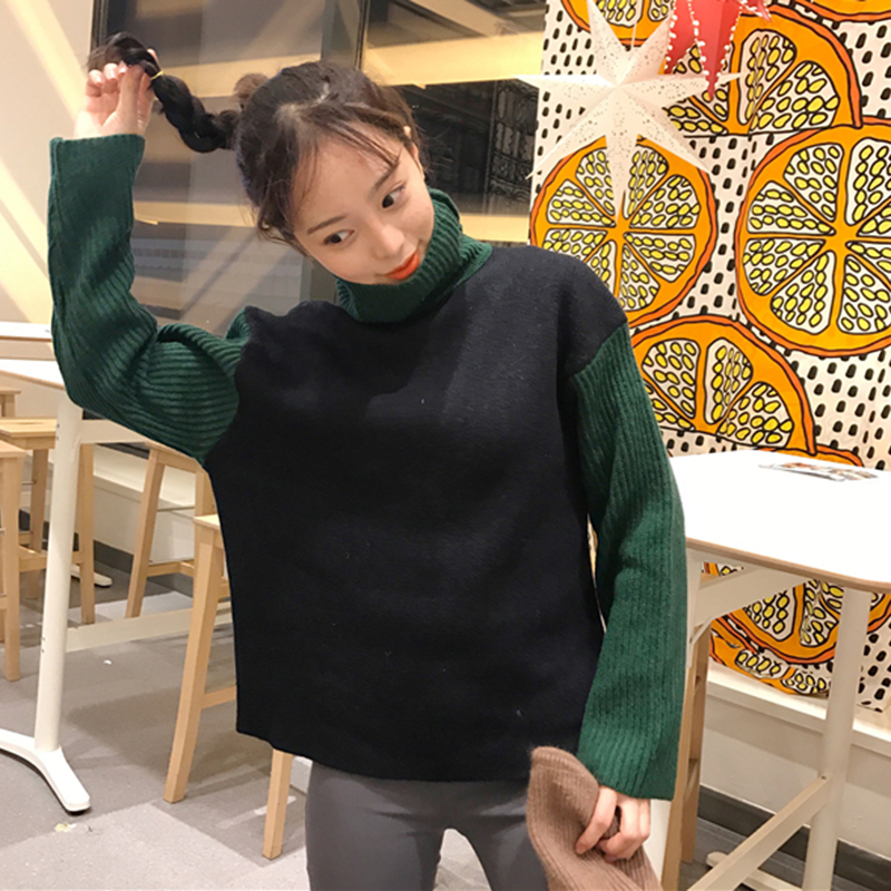 秋冬女裝2018新款韓版撞色高領套頭毛衣外套時尚百搭寬松針織衫潮