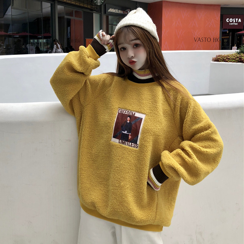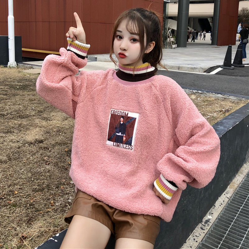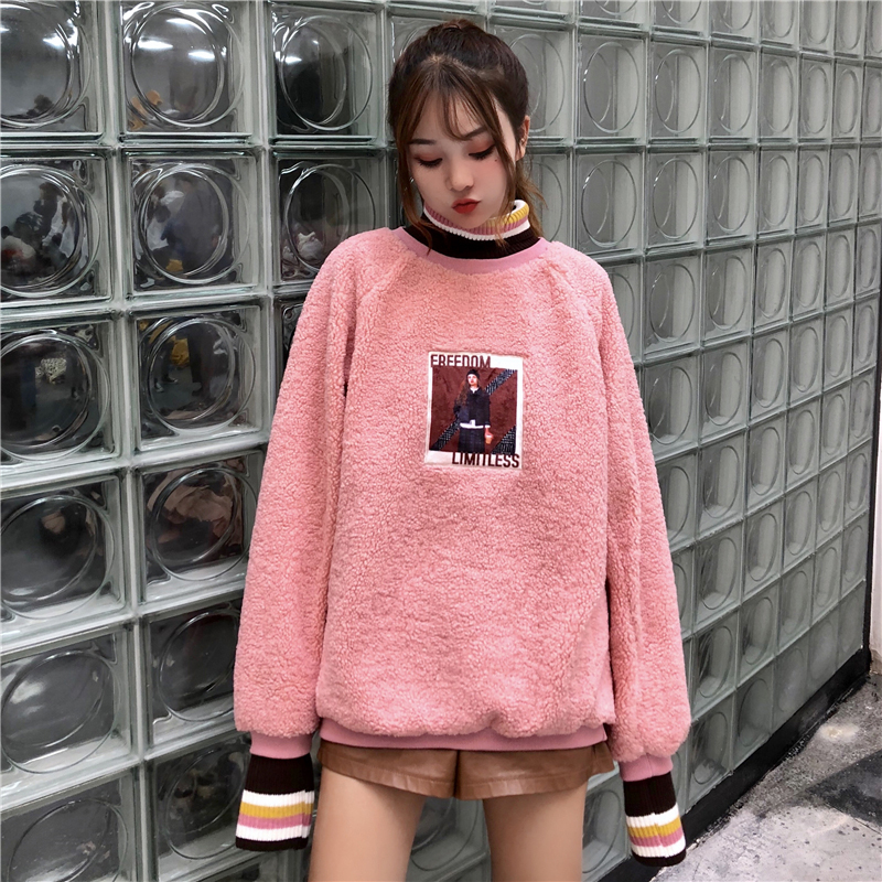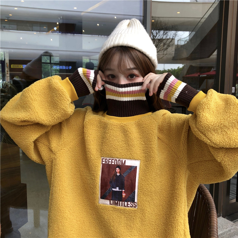 女冬裝2018新款韓版拼接條紋高領人物圖案衛衣時尚套頭羊羔毛外套