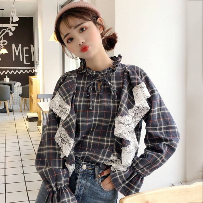 / 少女蕾絲荷葉邊襯衫2018秋裝新款學生甜美可愛燈籠長袖格子上衣潮