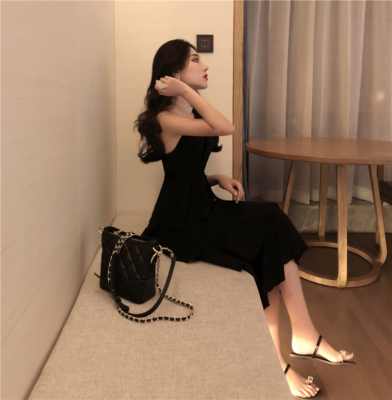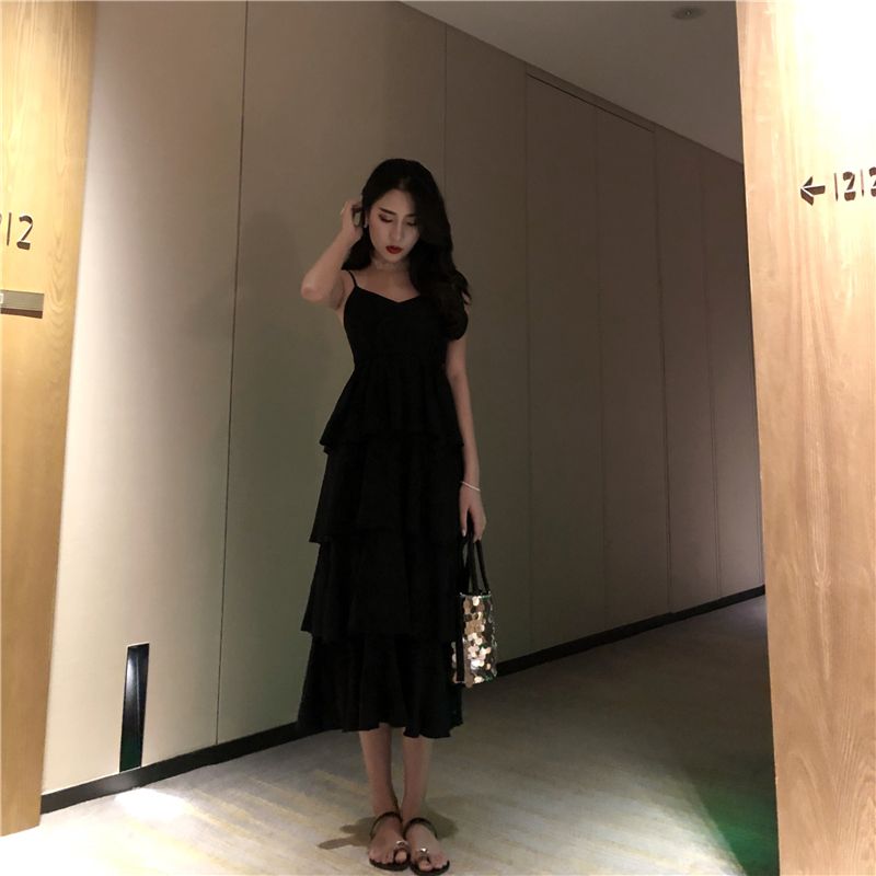 韓版時尚中長款V領連衣裙女夏2018新款松緊腰純色簡約吊帶蛋糕裙