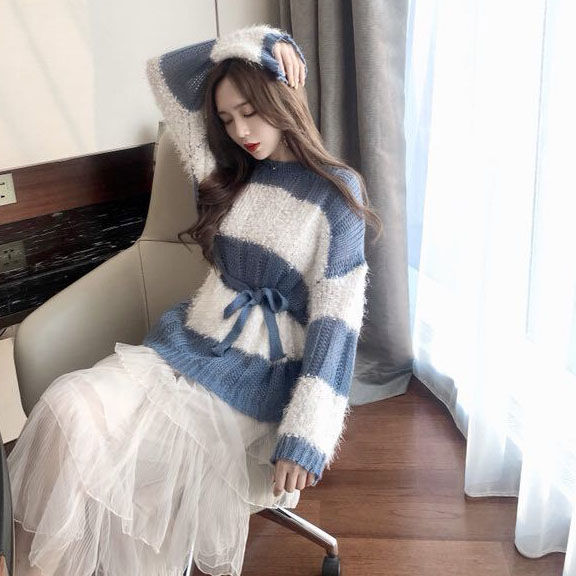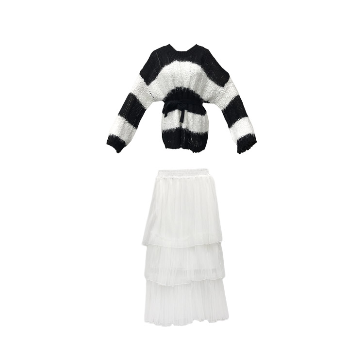 秋季套裝女時尚兩件套寬松長袖鏤空針織套頭慵懶條紋毛衣+蛋糕裙