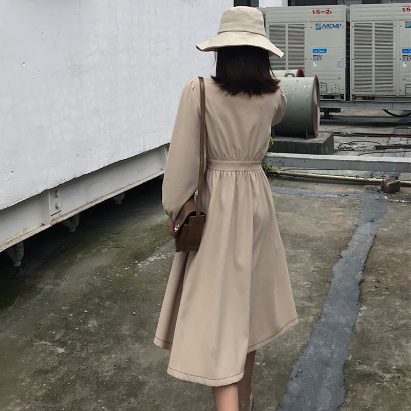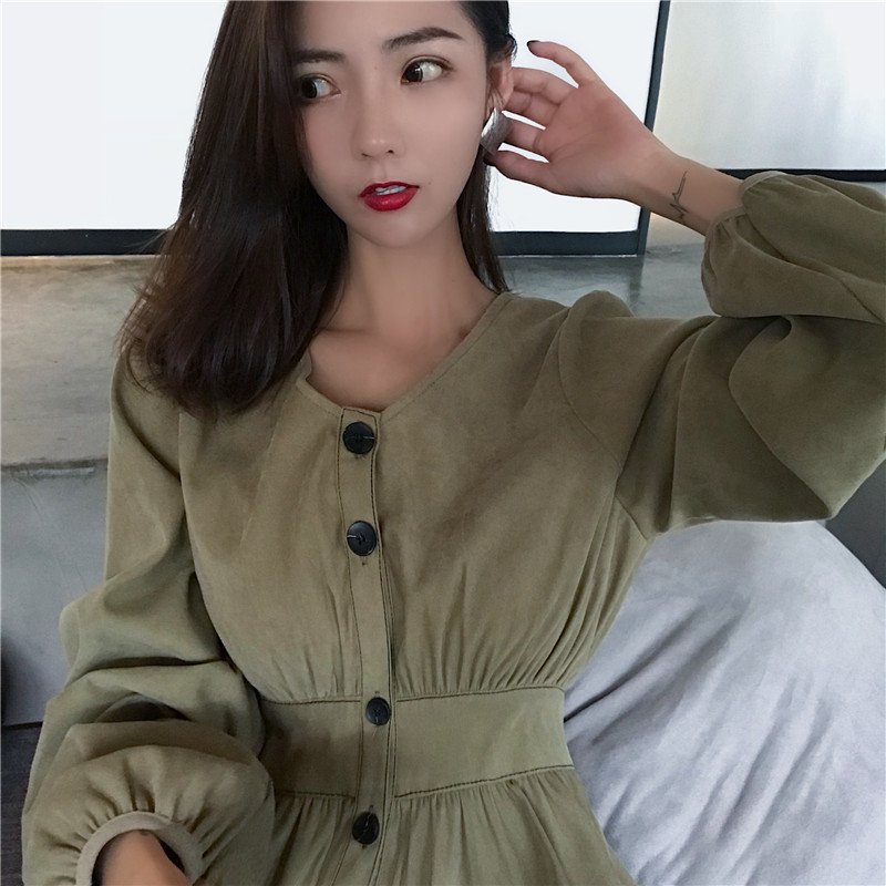 時尚裙子秋裝女2018新款燈籠袖高腰A字中長裙一排扣V領長袖連衣裙