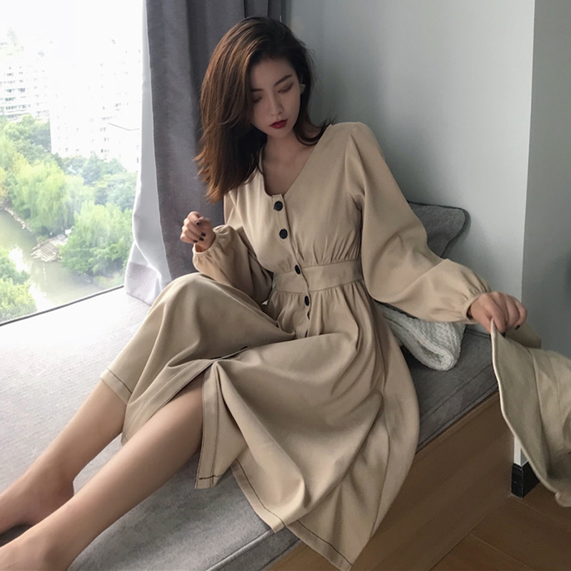 / 時尚裙子秋裝女2018新款燈籠袖高腰A字中長裙一排扣V領長袖連衣裙