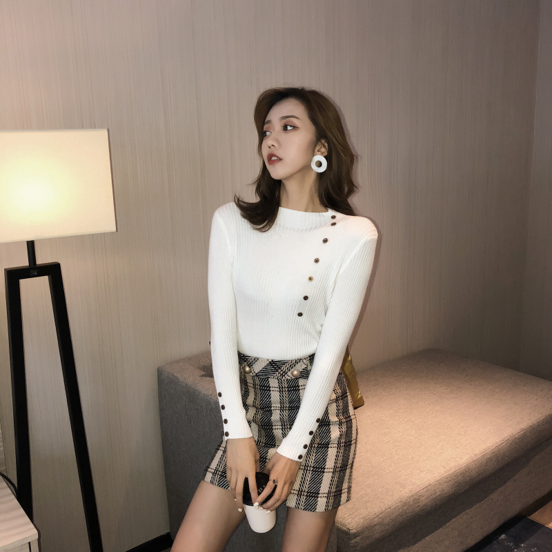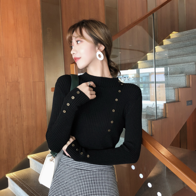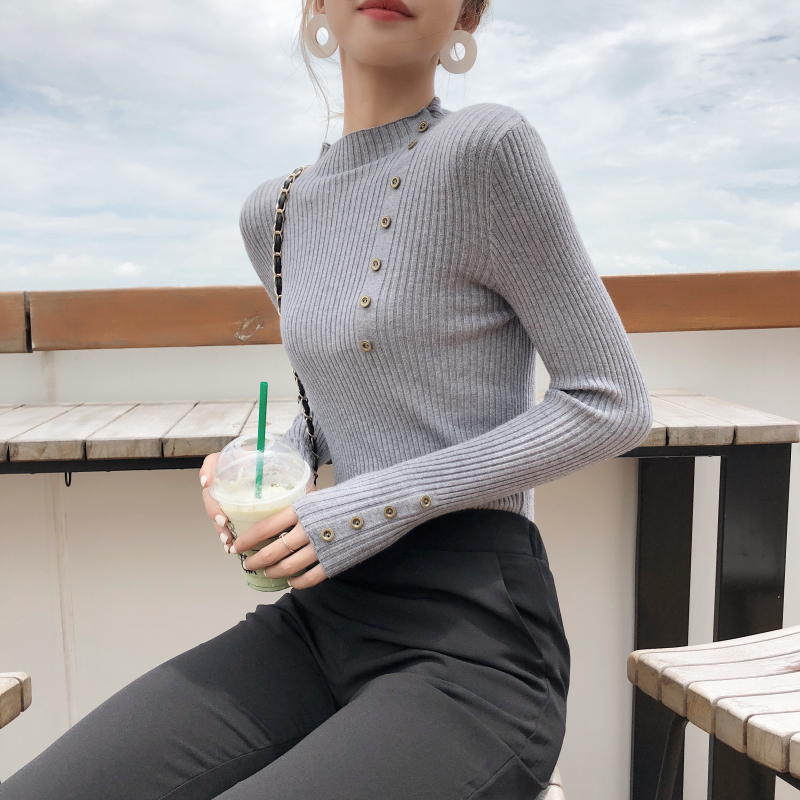 初秋溫柔風毛衣純色半高領紐扣針織衫修身長袖打底套頭加厚女上衣