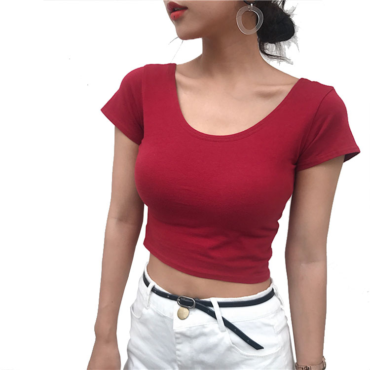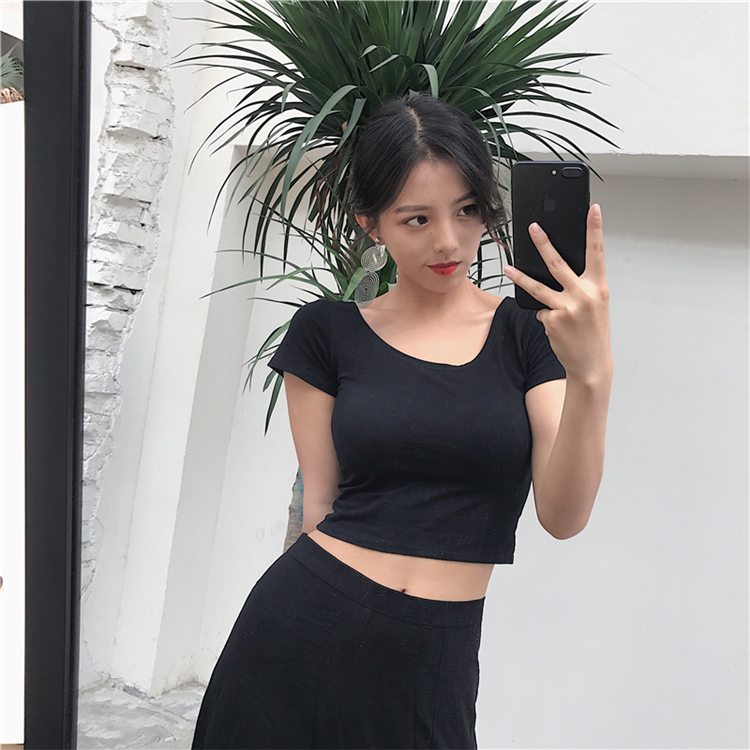 夏裝2018新款短款緊身T恤顯瘦百搭純色時尚簡約短袖U領上衣打底衫