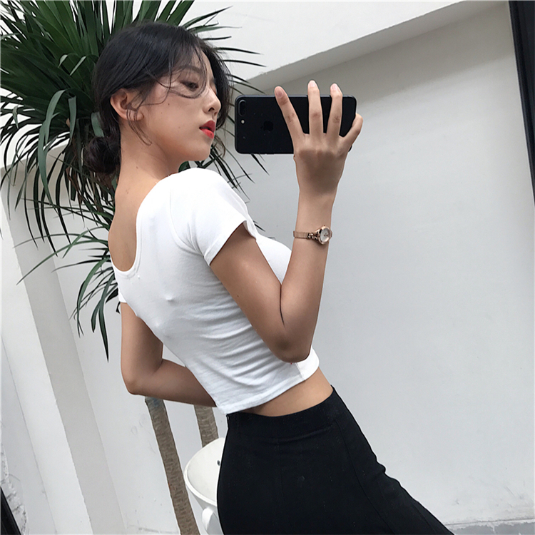 / 夏裝2018新款短款緊身T恤顯瘦百搭純色時尚簡約短袖U領上衣打底衫