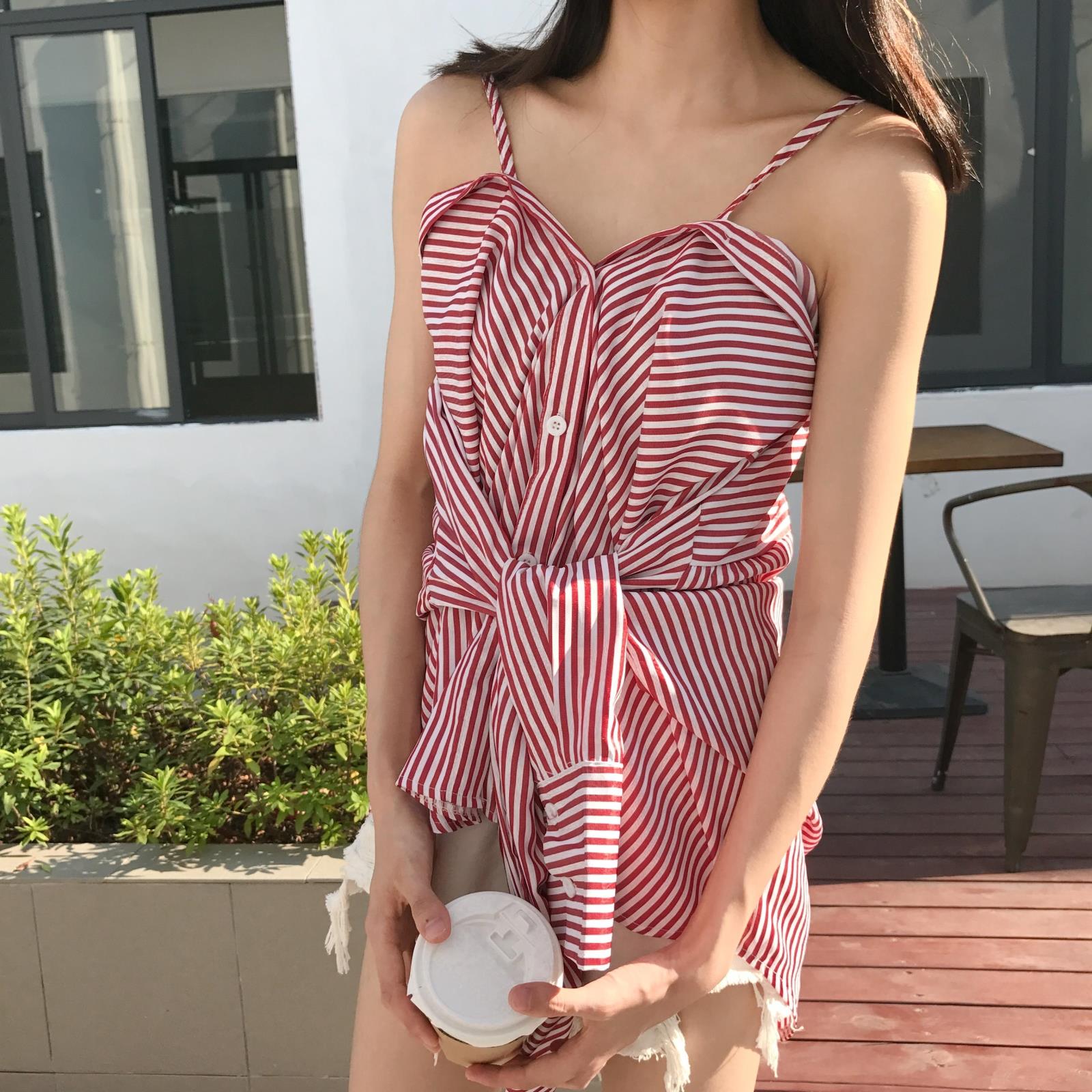 條紋長袖女襯衫學生韓版chic寬松顯瘦百搭一字領露肩吊帶多穿上衣