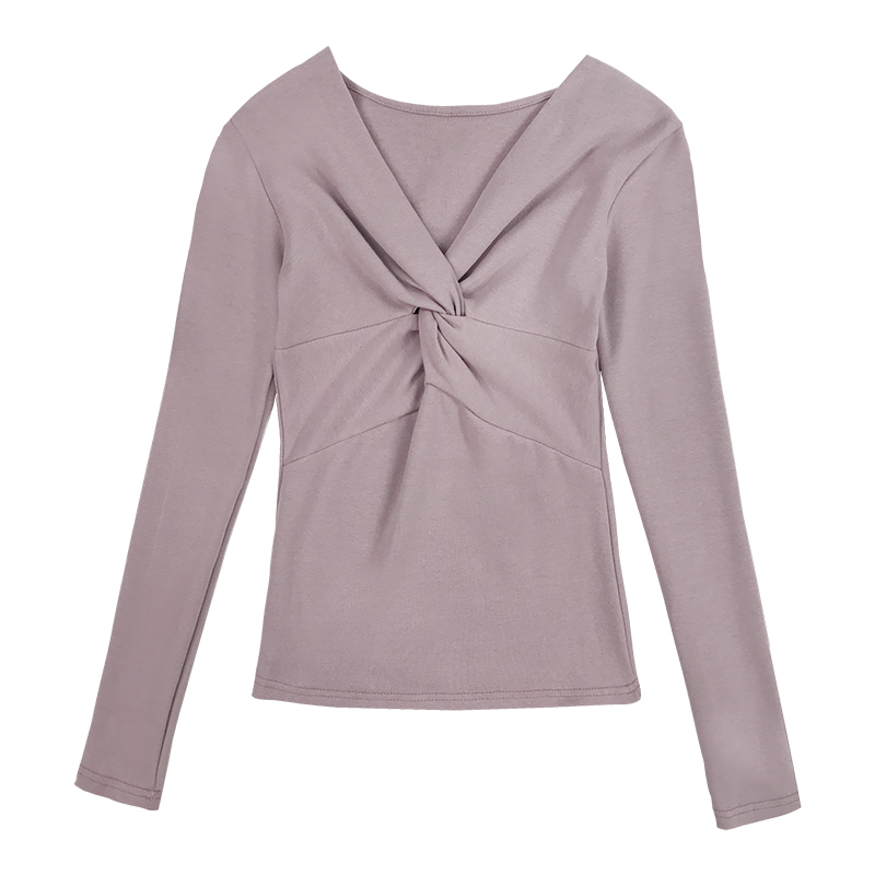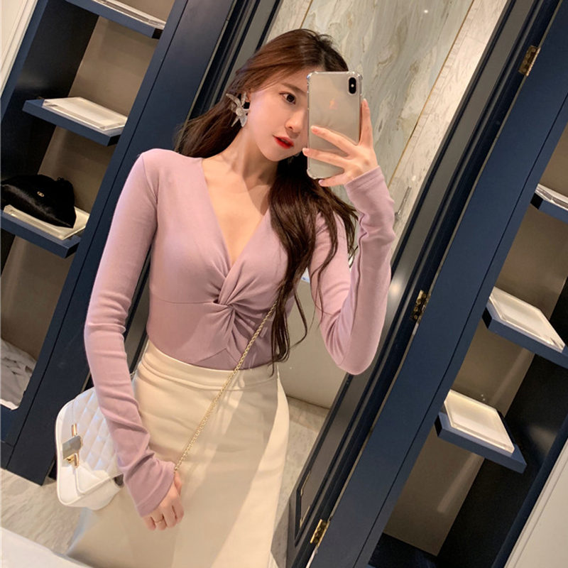 chic扭結V領打底衫女秋冬裝2018新款韓版氣質修身顯瘦長袖T恤上衣