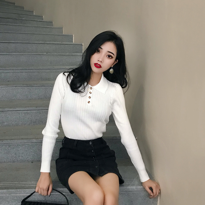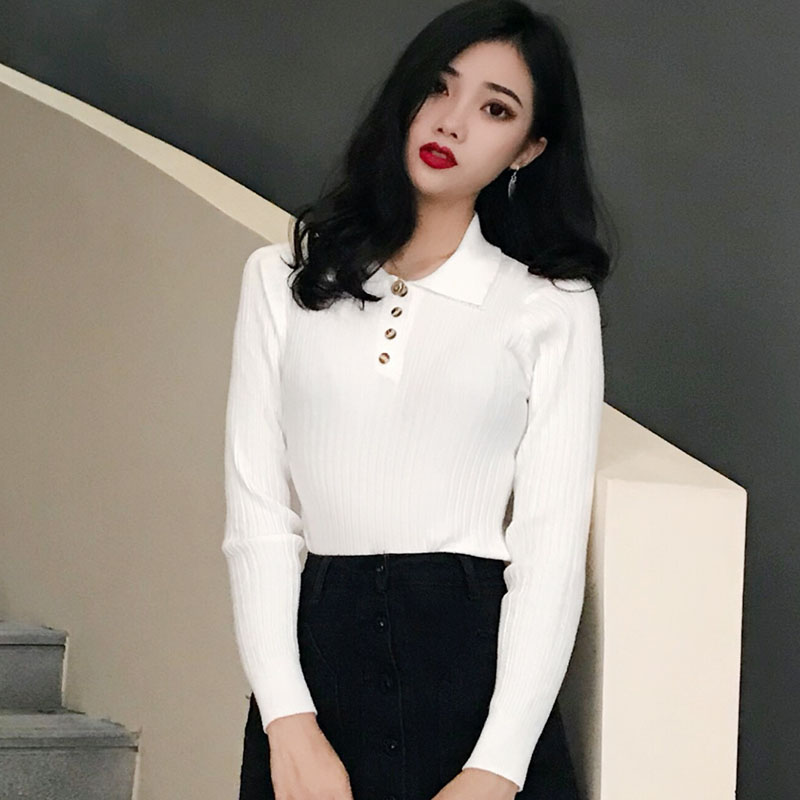 / 秋冬韓版chic純色修身顯瘦打底衫Polo領排扣套頭針織衫毛衣女上衣
