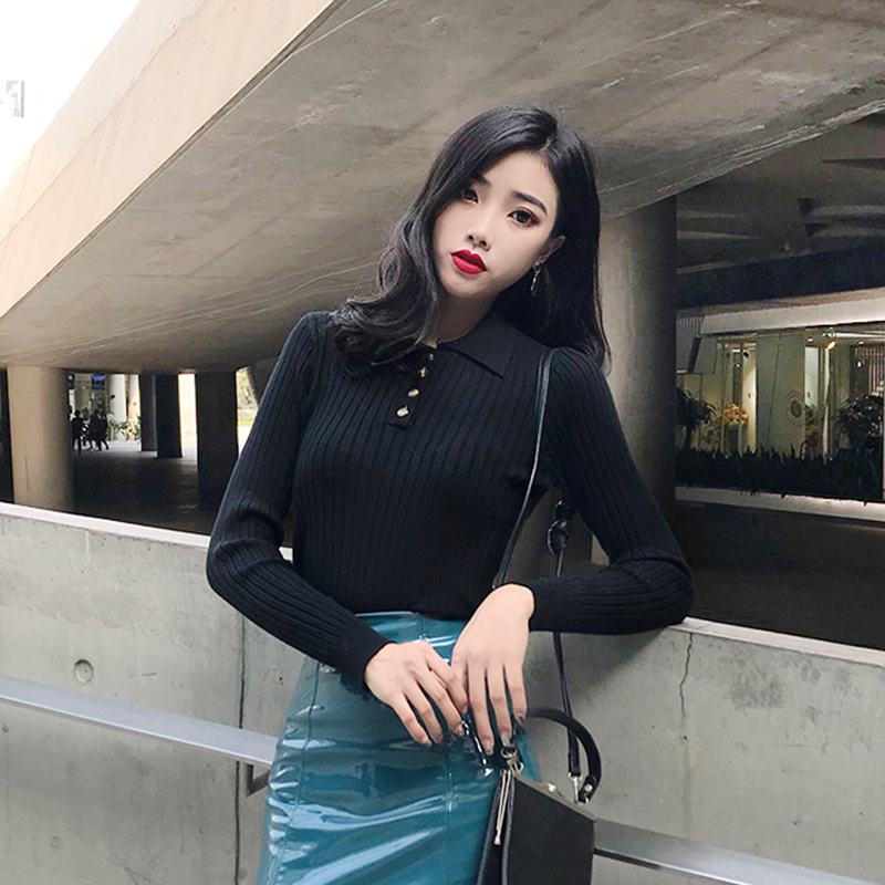 秋冬韓版chic純色修身顯瘦打底衫Polo領排扣套頭針織衫毛衣女上衣