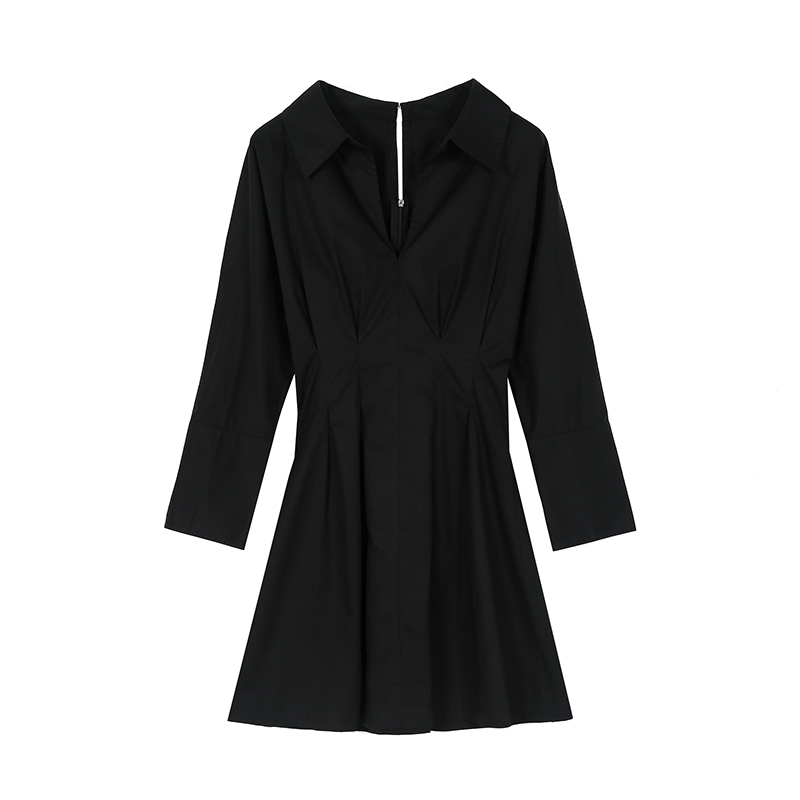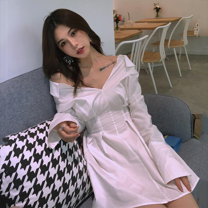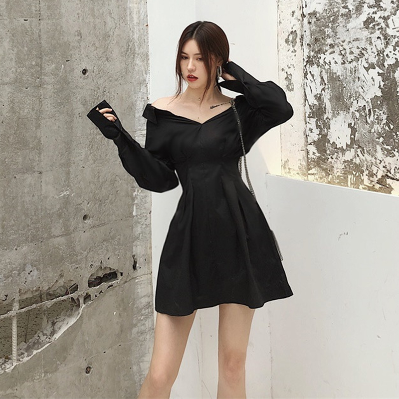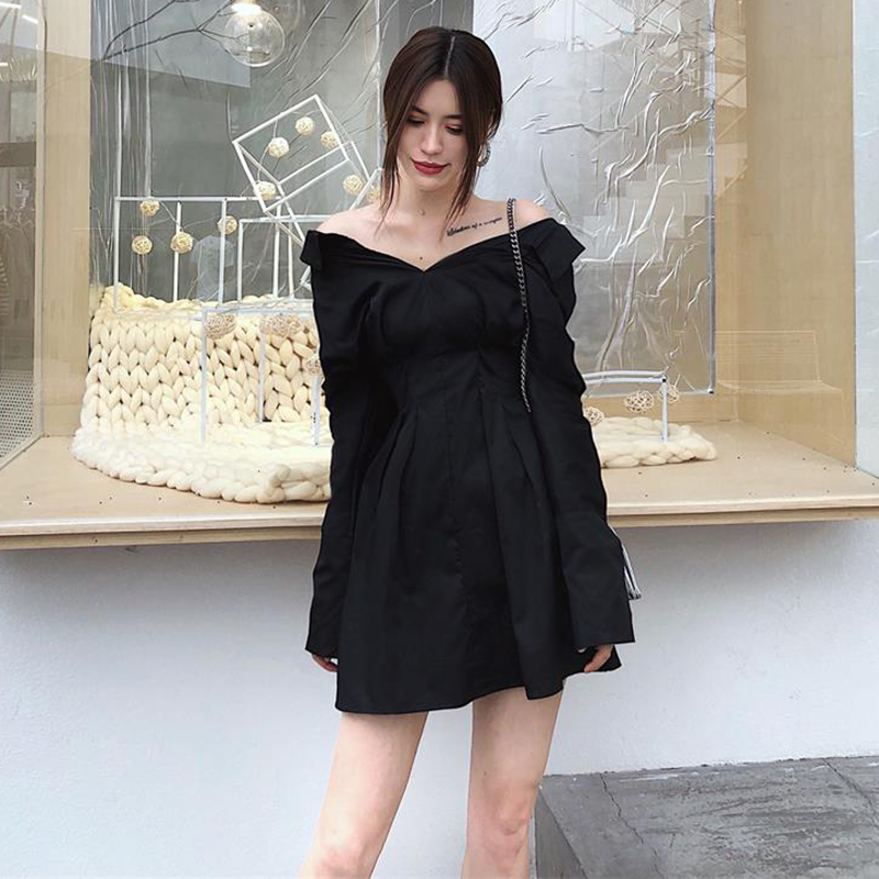 / 黑裙子女秋裝2018新款港味氣質收腰露肩襯衫裙修身長袖A字連衣裙