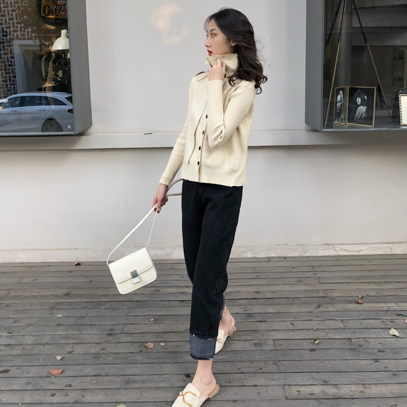 洋氣套裝女秋冬新款氣質修身單排扣針織衫高腰顯瘦直筒牛仔長褲子