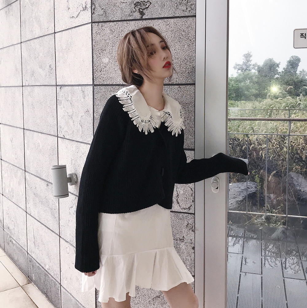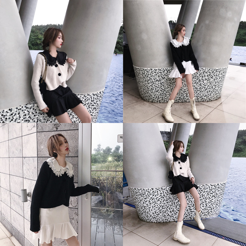 韓版娃娃領系扣長袖針織開衫毛衣外套+高腰系帶蝴蝶結百褶裙褲女