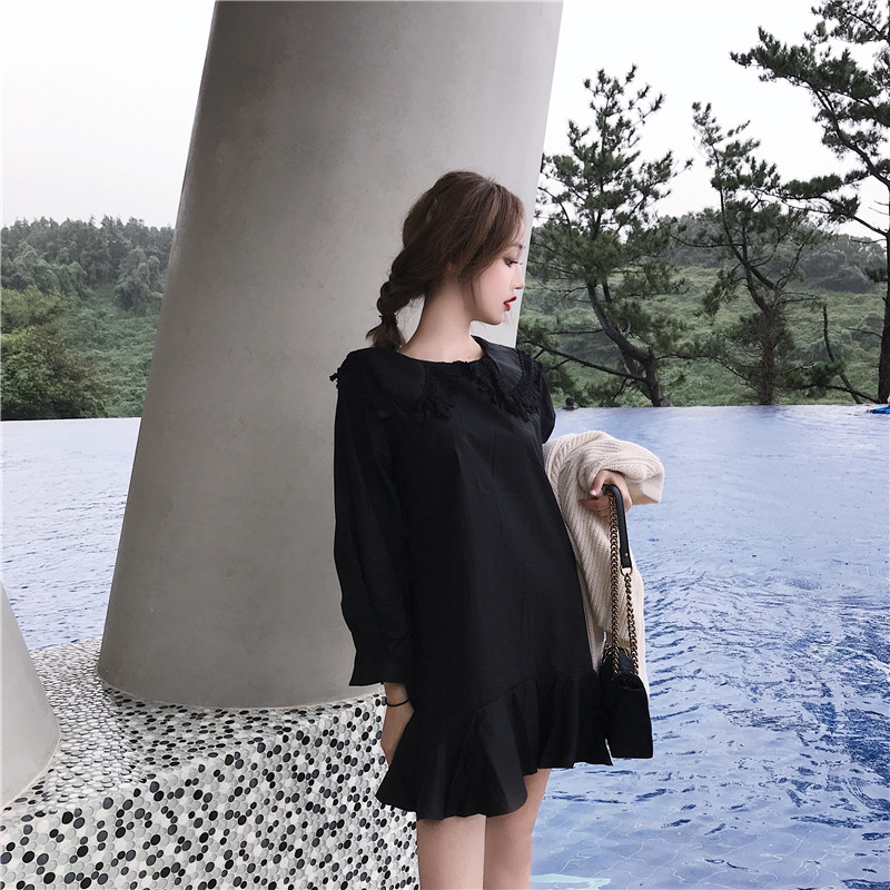 chic早秋裙子長裙女慵懶風韓版百搭娃娃領絲絨蕾絲顯瘦長袖連衣裙