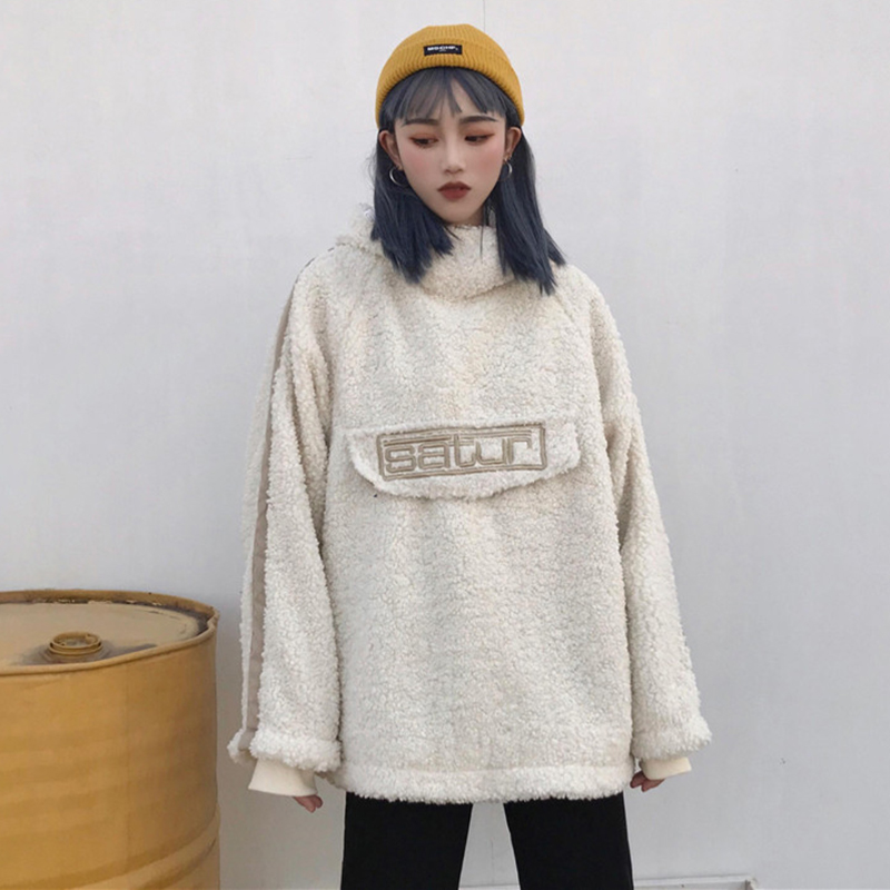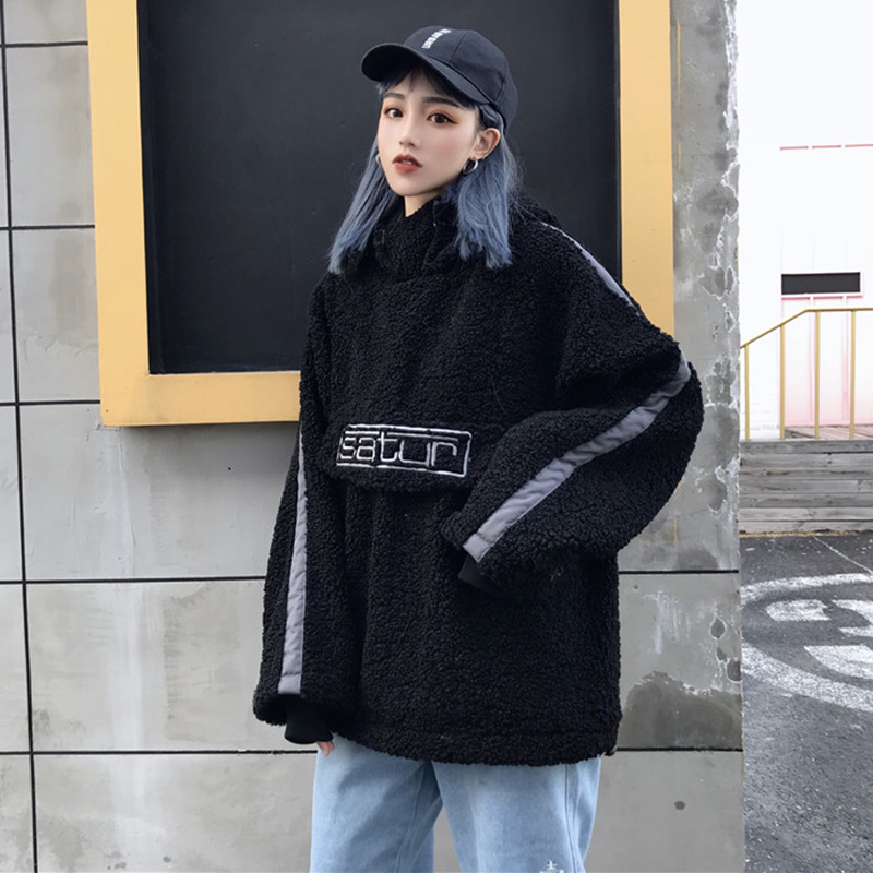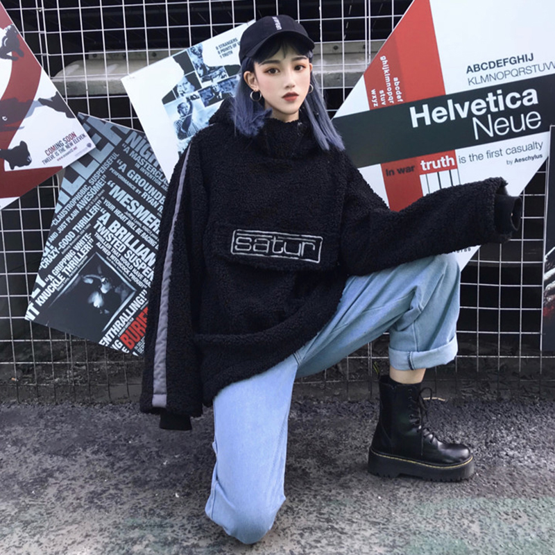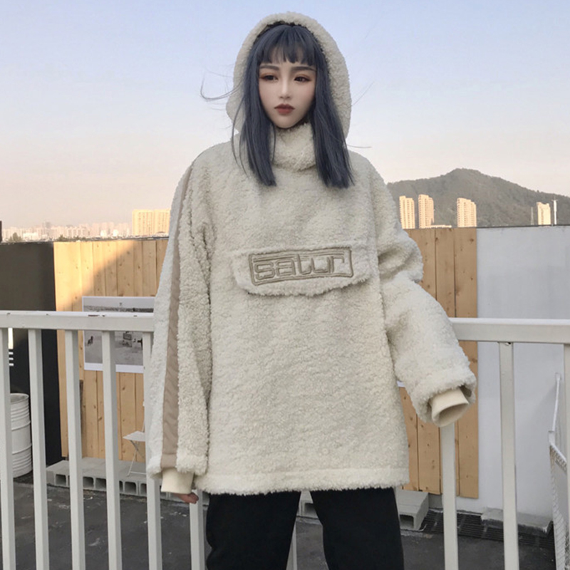 / 時尚字母羊羔毛外套秋冬女裝2018新款港風學生寬松連帽休閑上衣潮