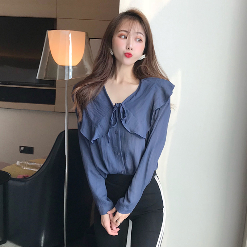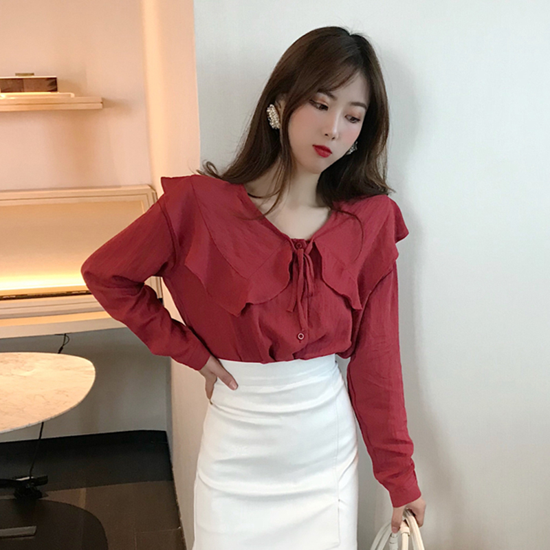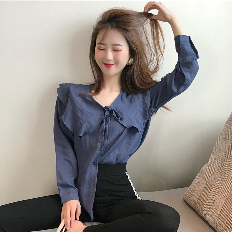 淑女氣質娃娃領長袖系帶上衣秋季女裝2018新款修身顯瘦荷葉邊襯衫