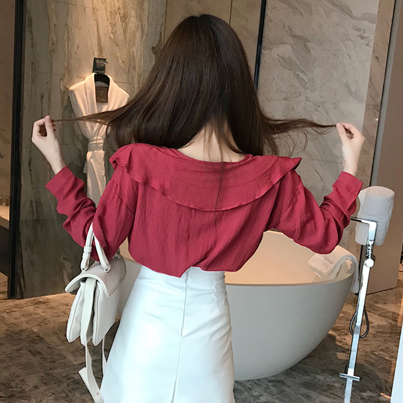 / 淑女氣質娃娃領長袖系帶上衣秋季女裝2018新款修身顯瘦荷葉邊襯衫