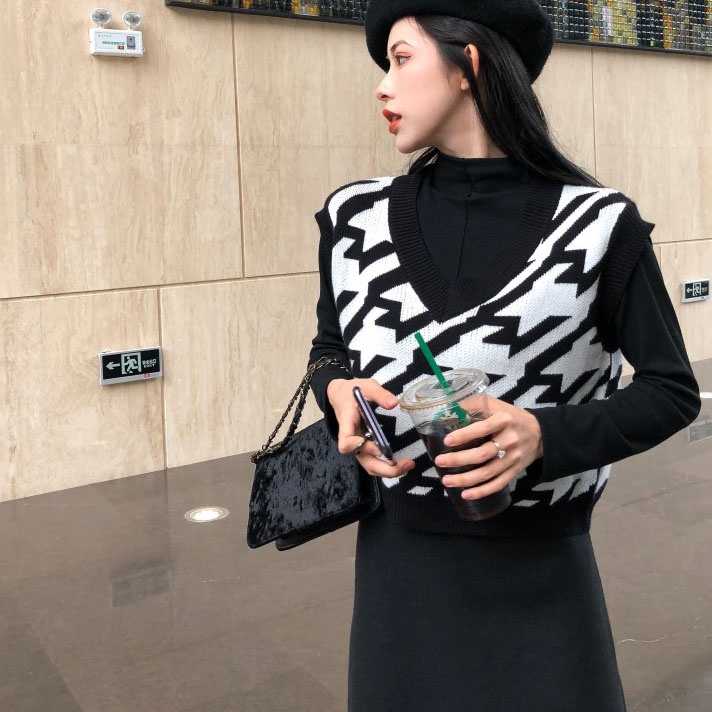 秋裝女2018新款網紅氣質女神毛衣針織馬甲+長款黑色打底連衣裙女