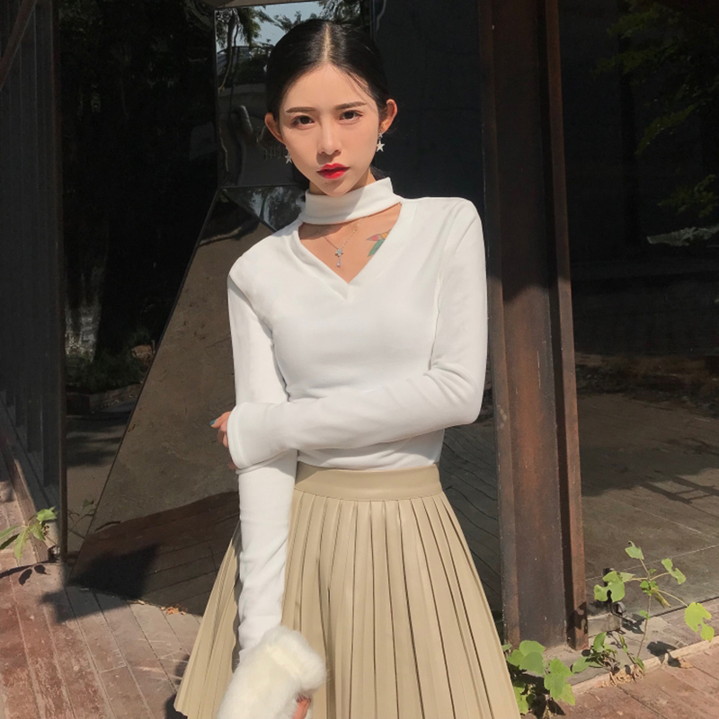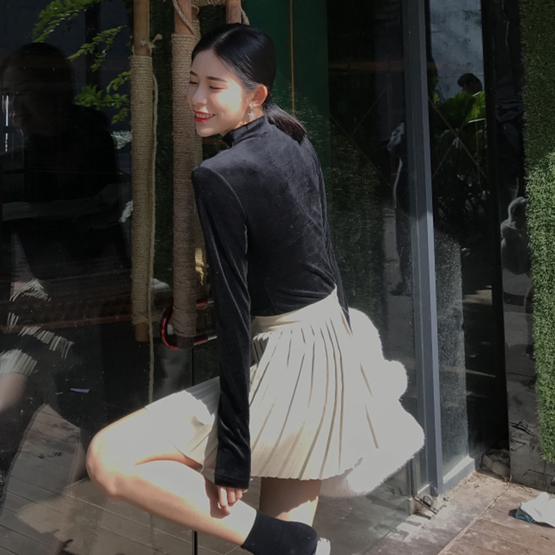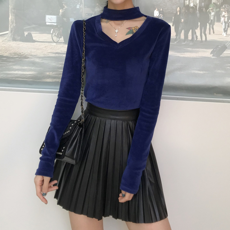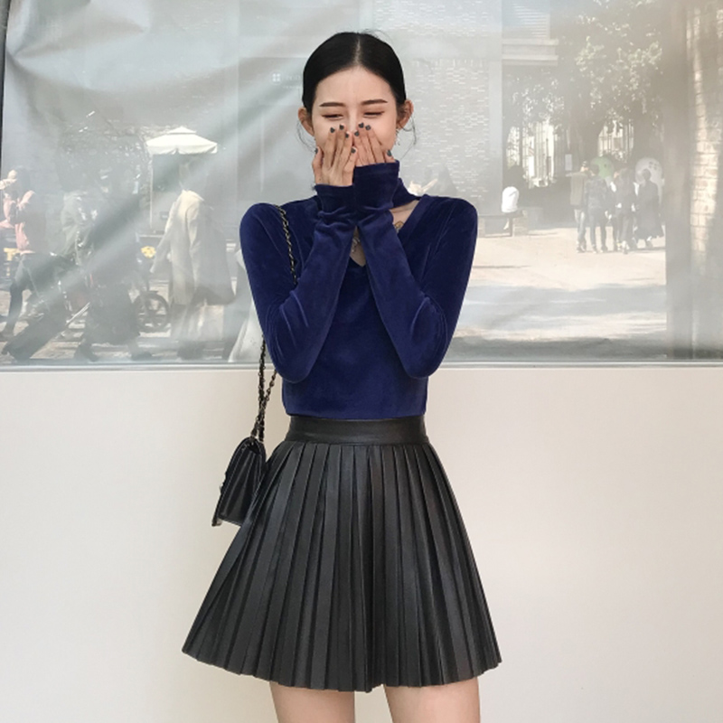 秋冬2018新款套裝女掛脖V領絲絨長袖打底上衣PU皮百褶A字半身裙子