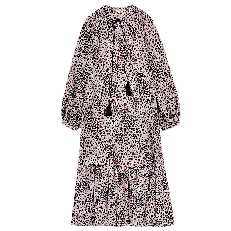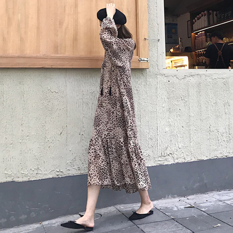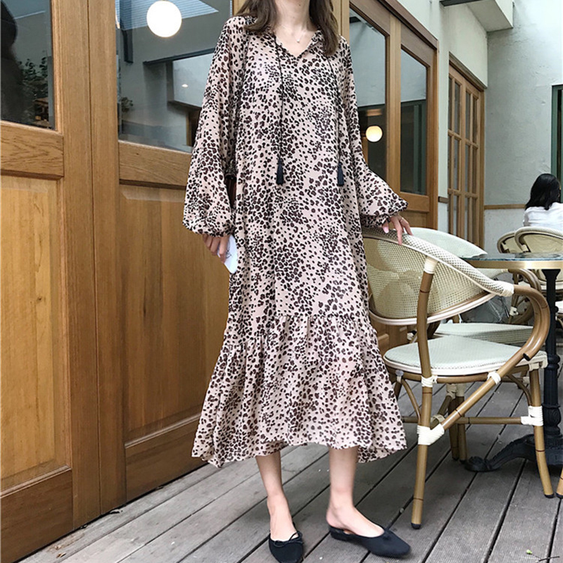/ 秋裝女2018新款港味氣質豹紋燈籠袖雪紡連衣裙荷葉邊中長裙子吊帶