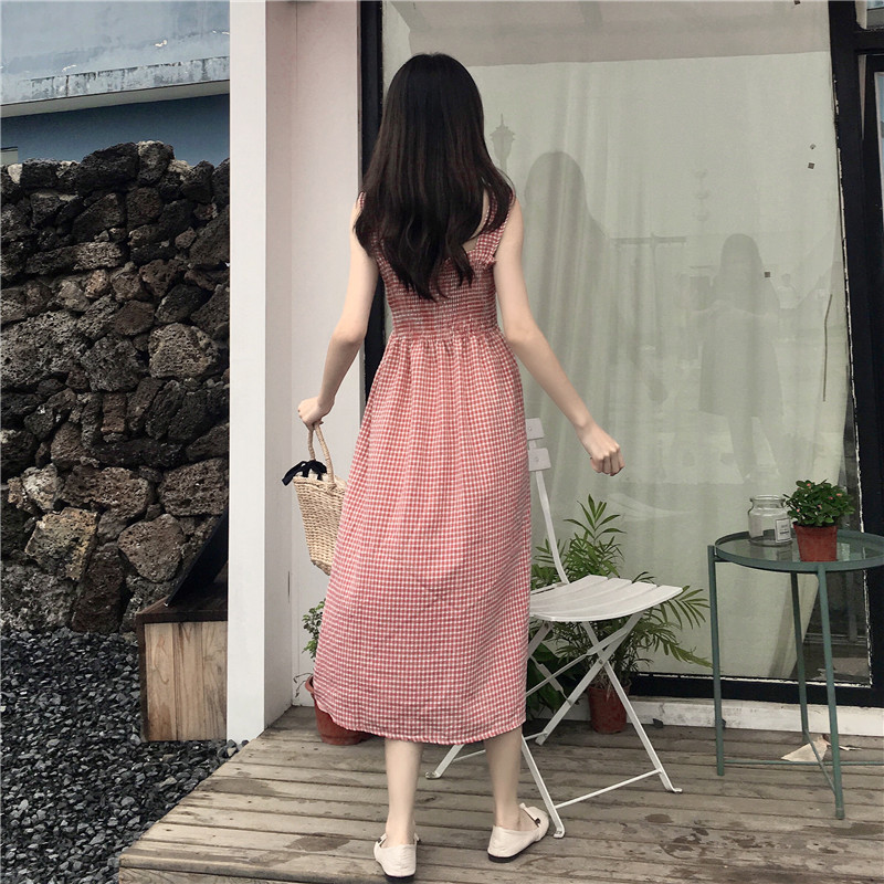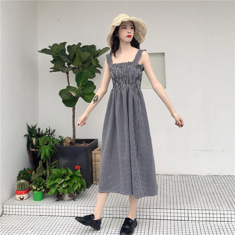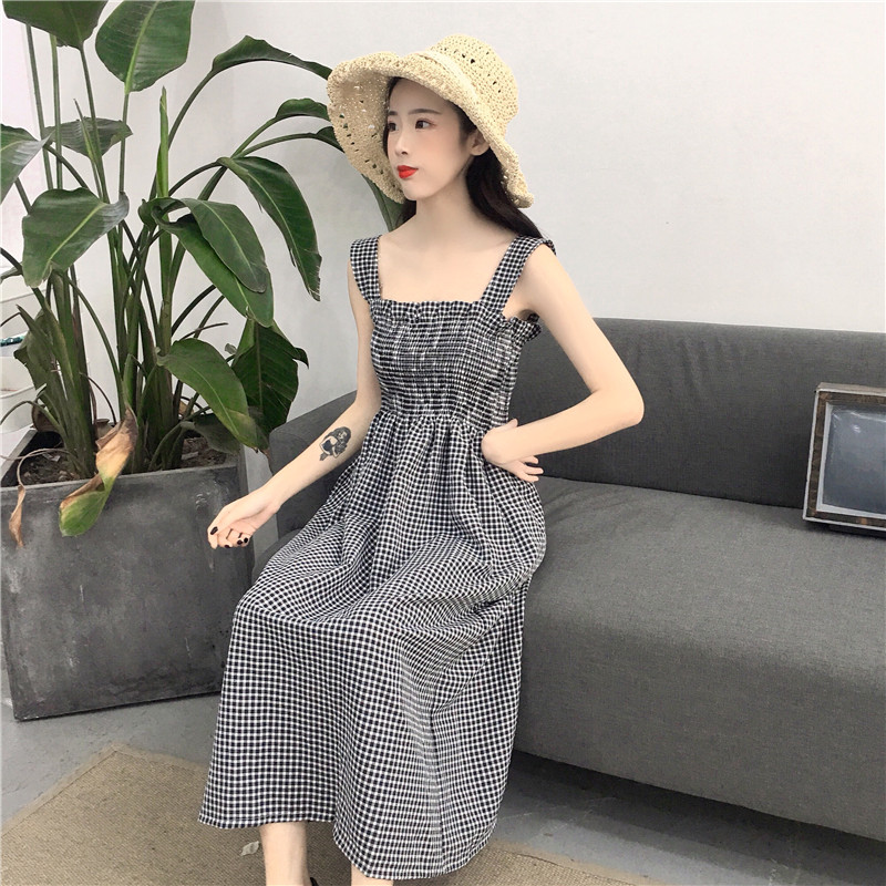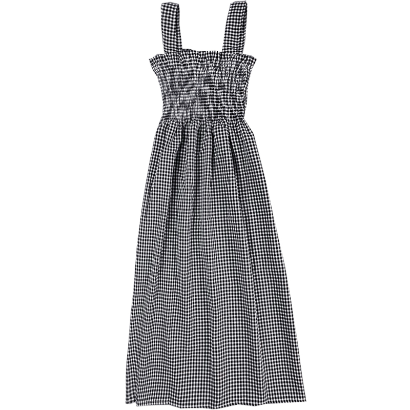 / 夏季新款女裝中長款抹胸格子高腰修身顯瘦學生無袖打底連衣裙長裙