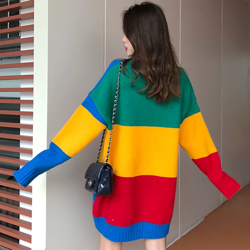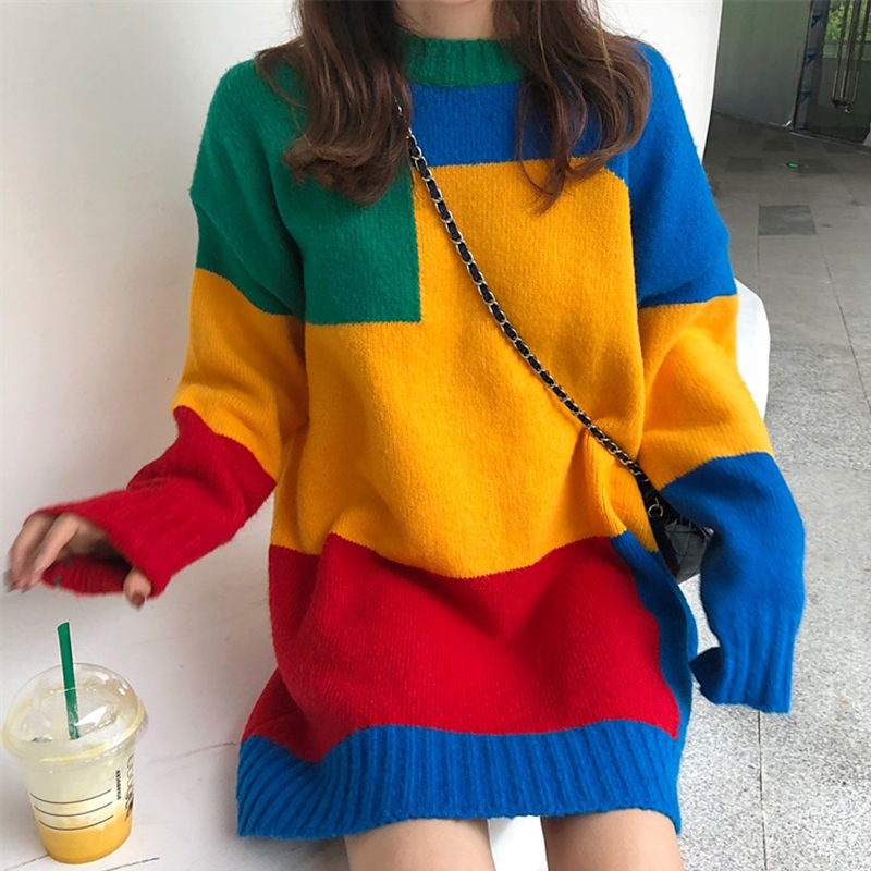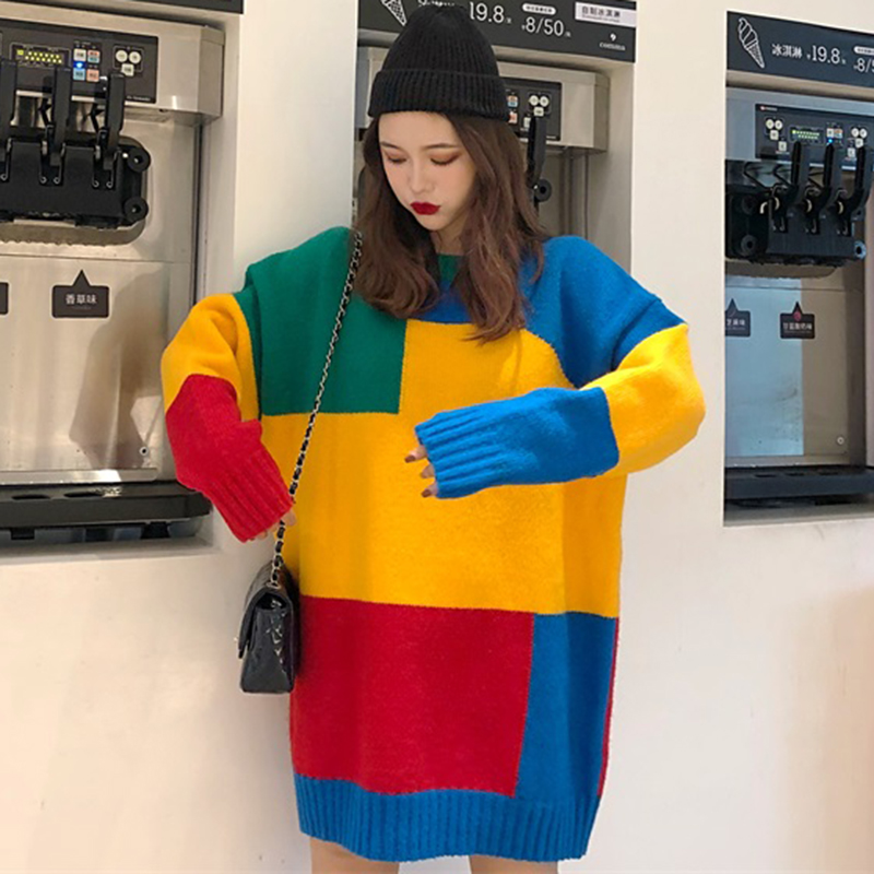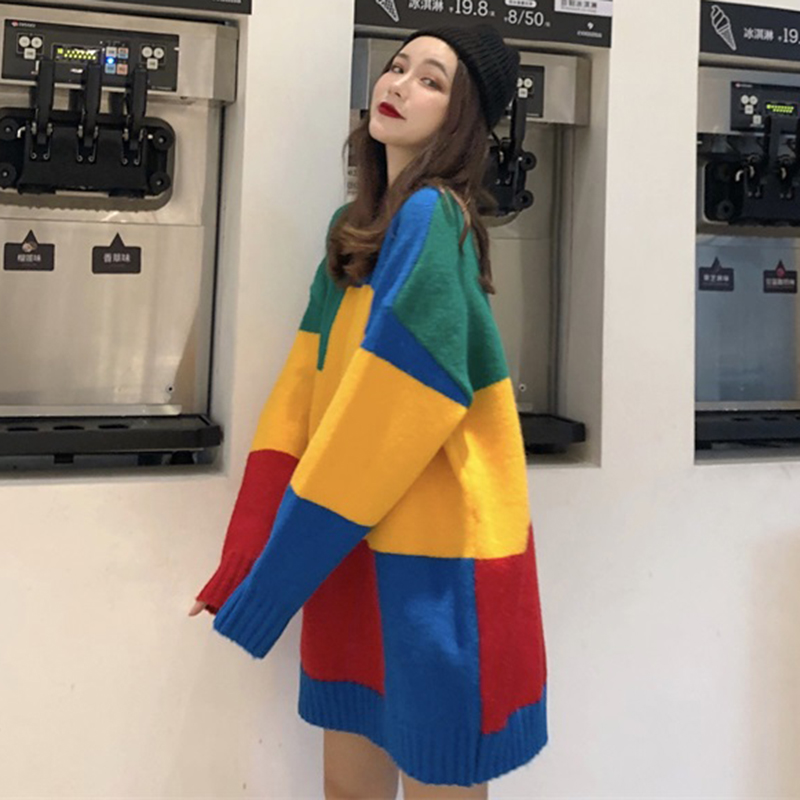 寬松圓領長袖毛衣女秋冬裝2018新款時尚拼色針織外套學生休閑上衣