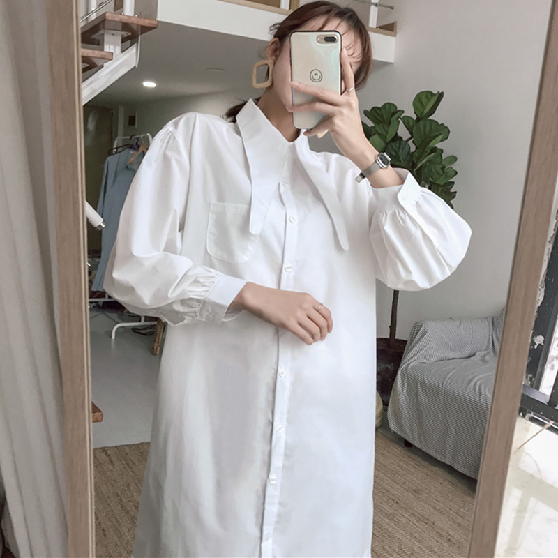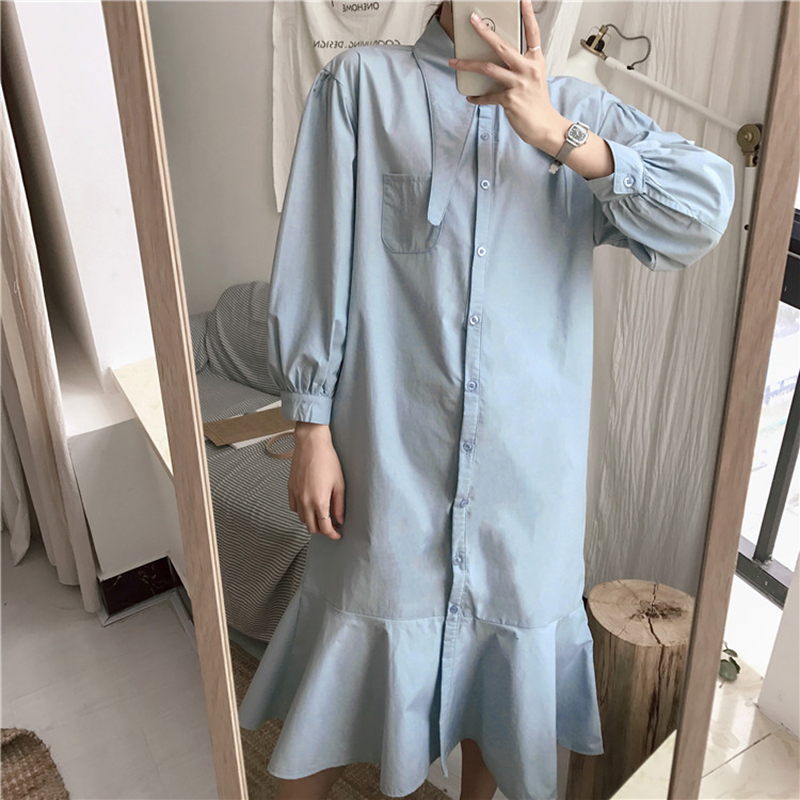 春季女裝新款韓版chic中長款翻領襯衫式連衣裙女學生荷葉邊魚尾裙
