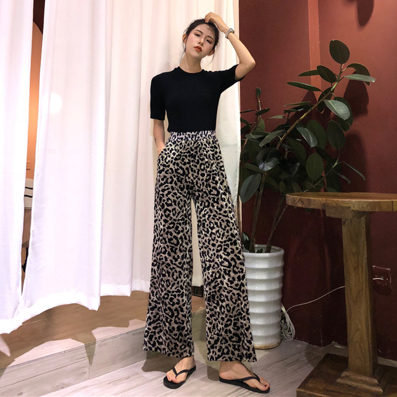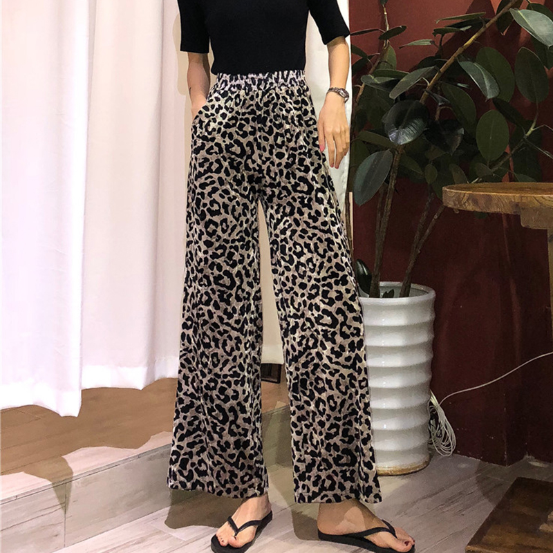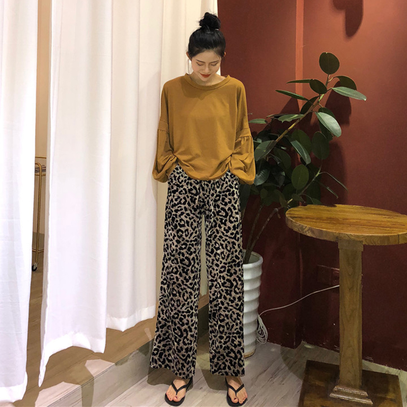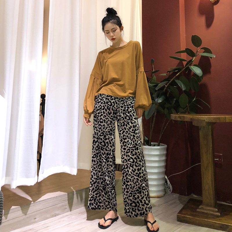 港味復古豹紋闊腿褲秋裝女2018新款高腰寬松直筒褲子洋氣休閑長褲