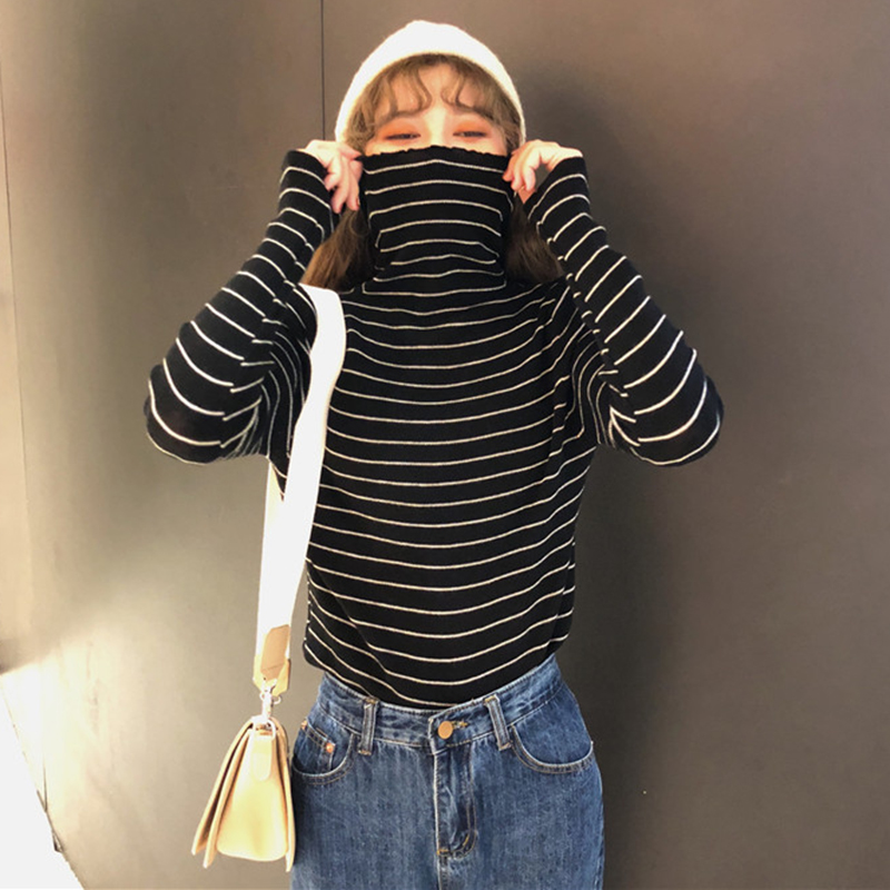 chic條紋高領長袖針織衫女秋冬裝2018新款韓版氣質修身打底薄毛衣