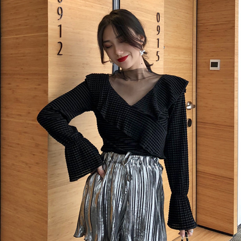 氣質復古絲絨T恤秋裝女2018新款時尚網紗拼接長袖上衣修身打底衫