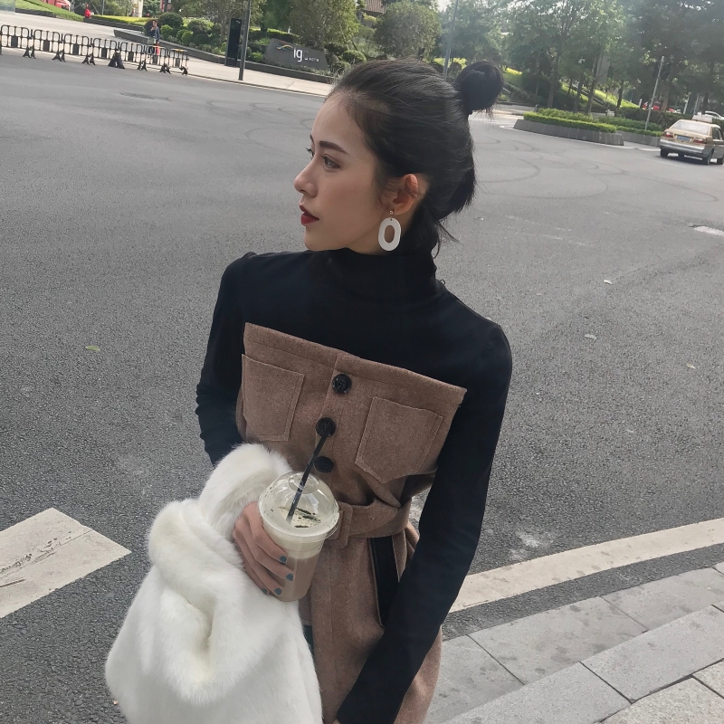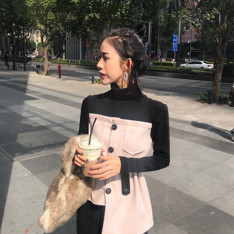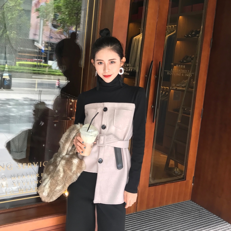 早秋衛衣2018新款女長袖韓版寬松高領拼接百搭不規則上衣配腰帶潮