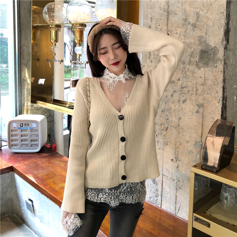 氣質女神兩件套冬裝新款時尚透視蕾絲打底衫寬松V領長袖針織開衫