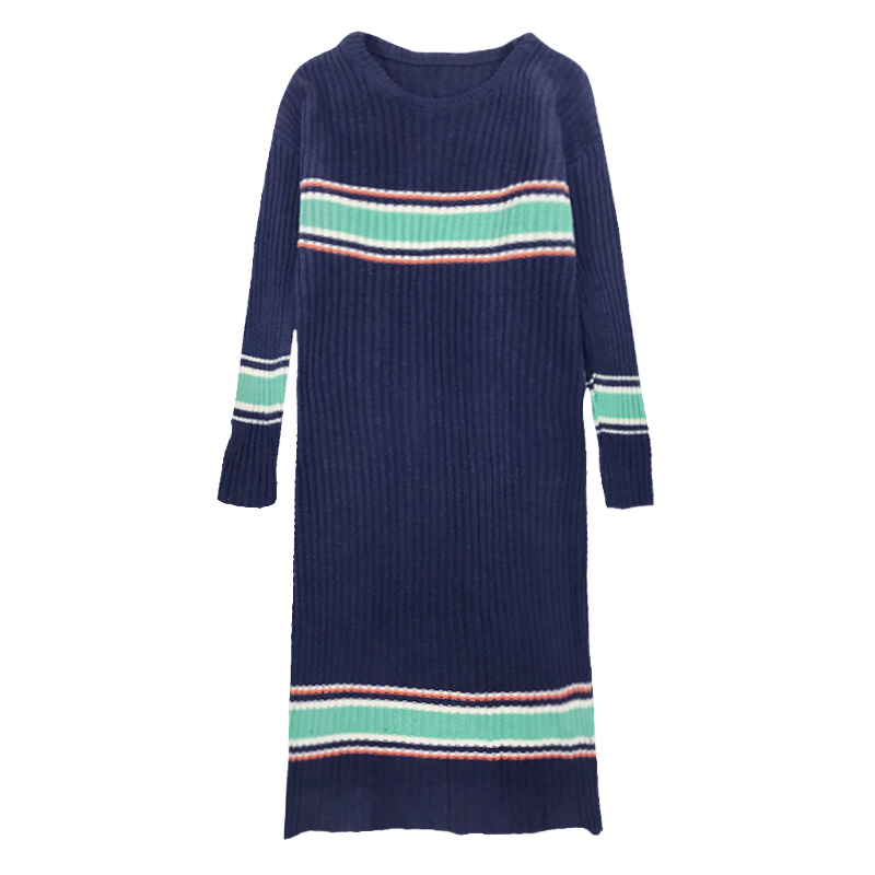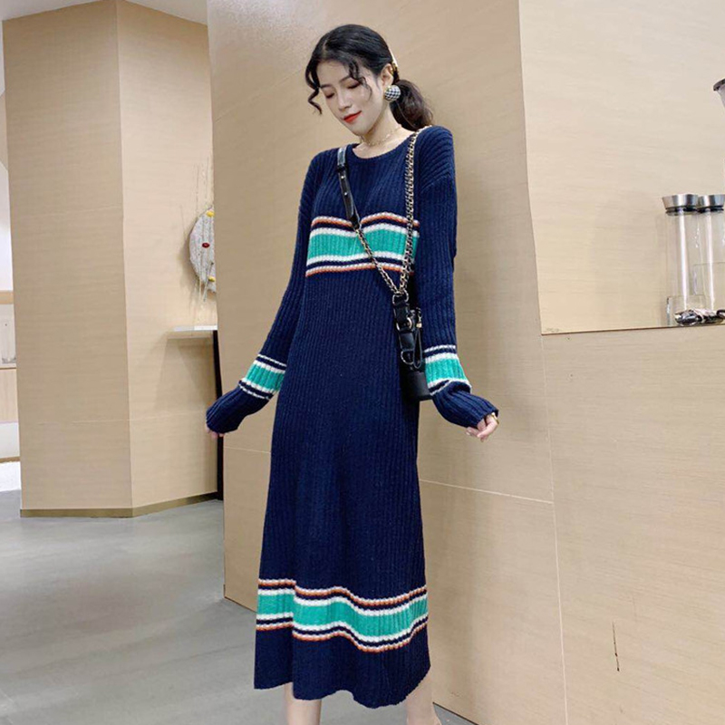秋冬裝2018新款時尚撞色條紋針織中長裙法式少女egg長袖連衣裙子