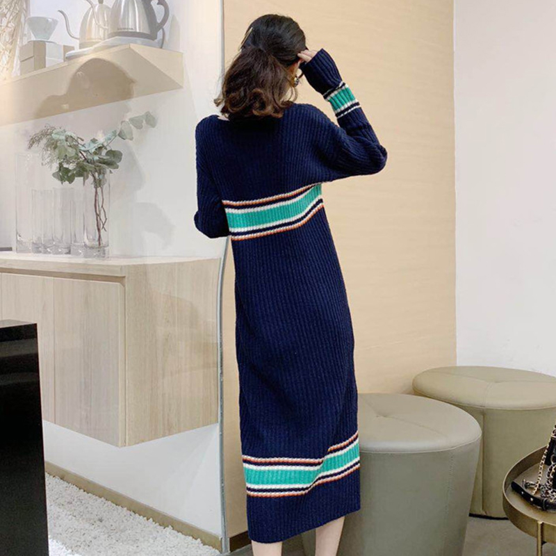 / 秋冬裝2018新款時尚撞色條紋針織中長裙法式少女egg長袖連衣裙子