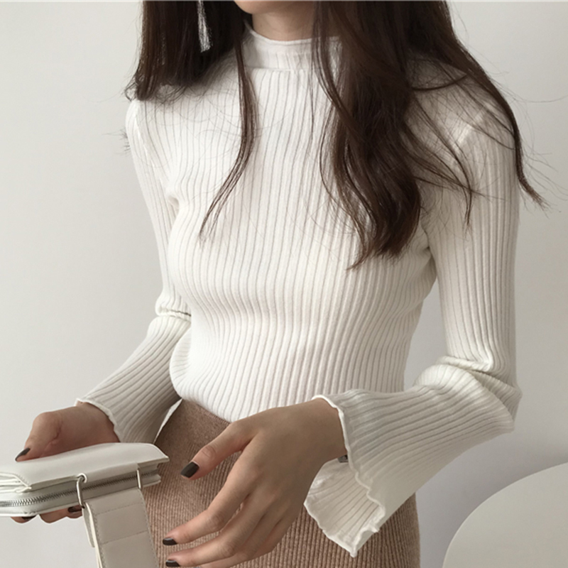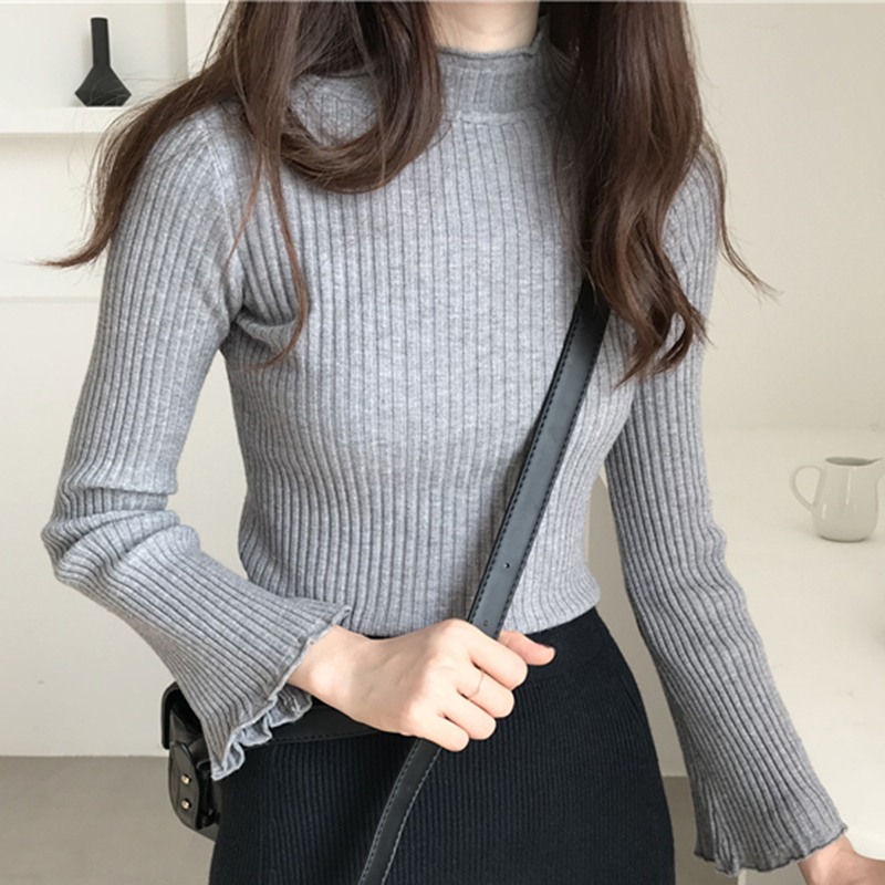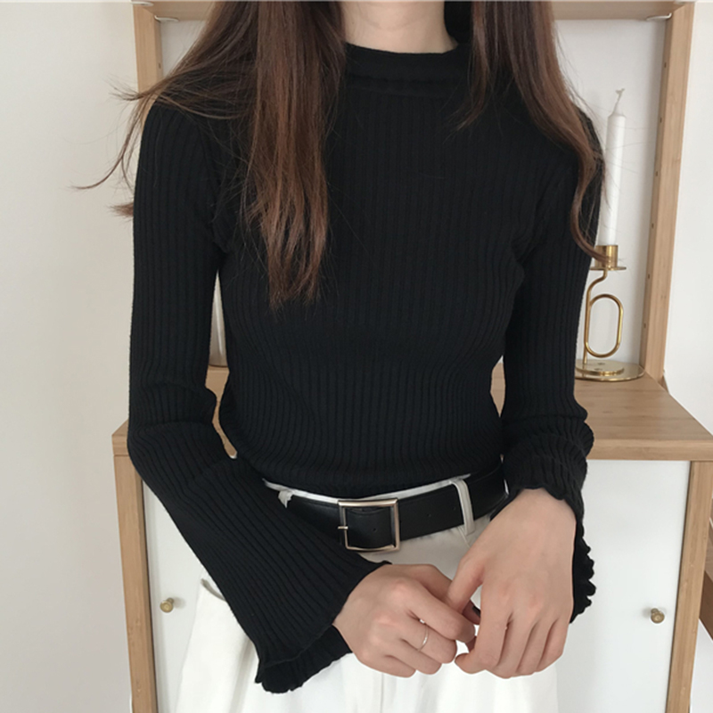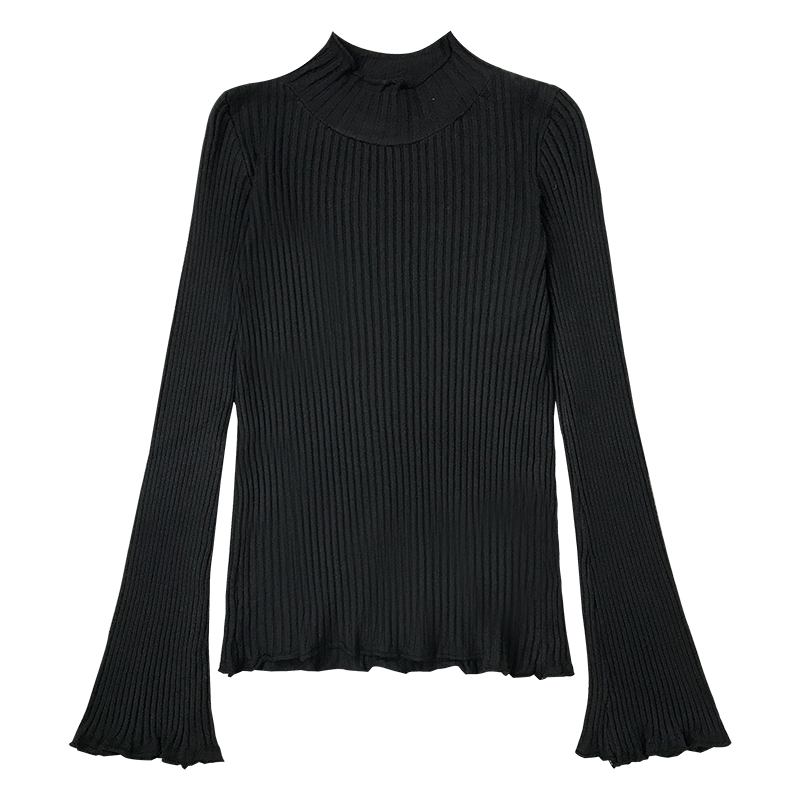 / 修身黑色打底衫秋裝女2018新款時尚半高領喇叭長袖毛衣休閑短上衣