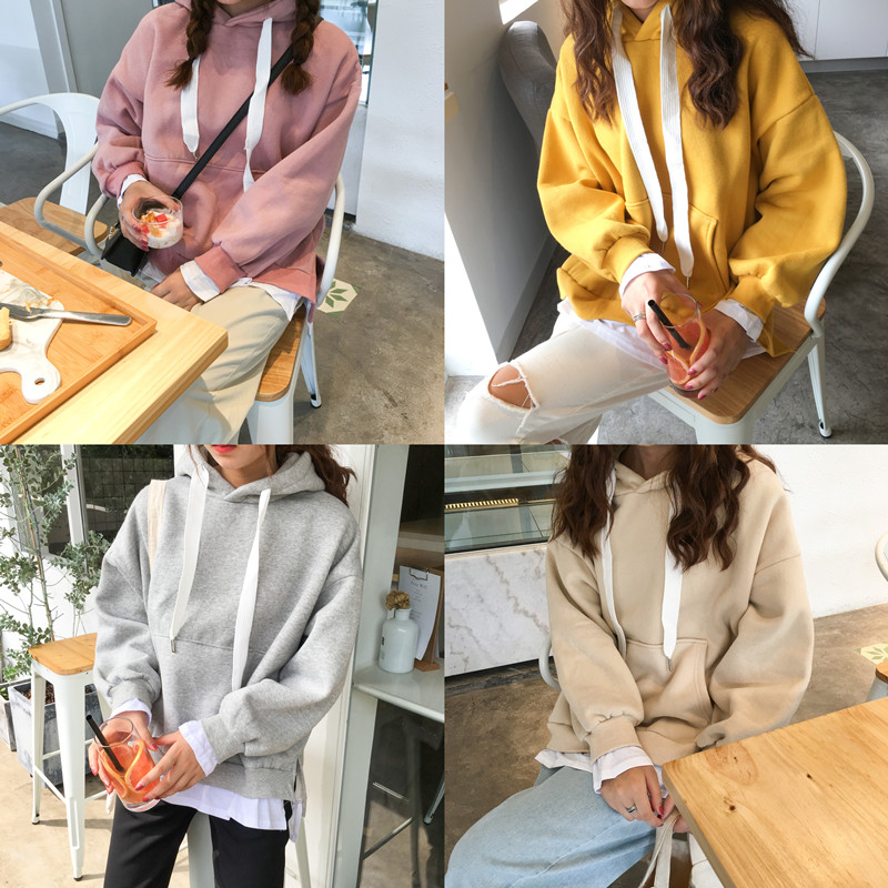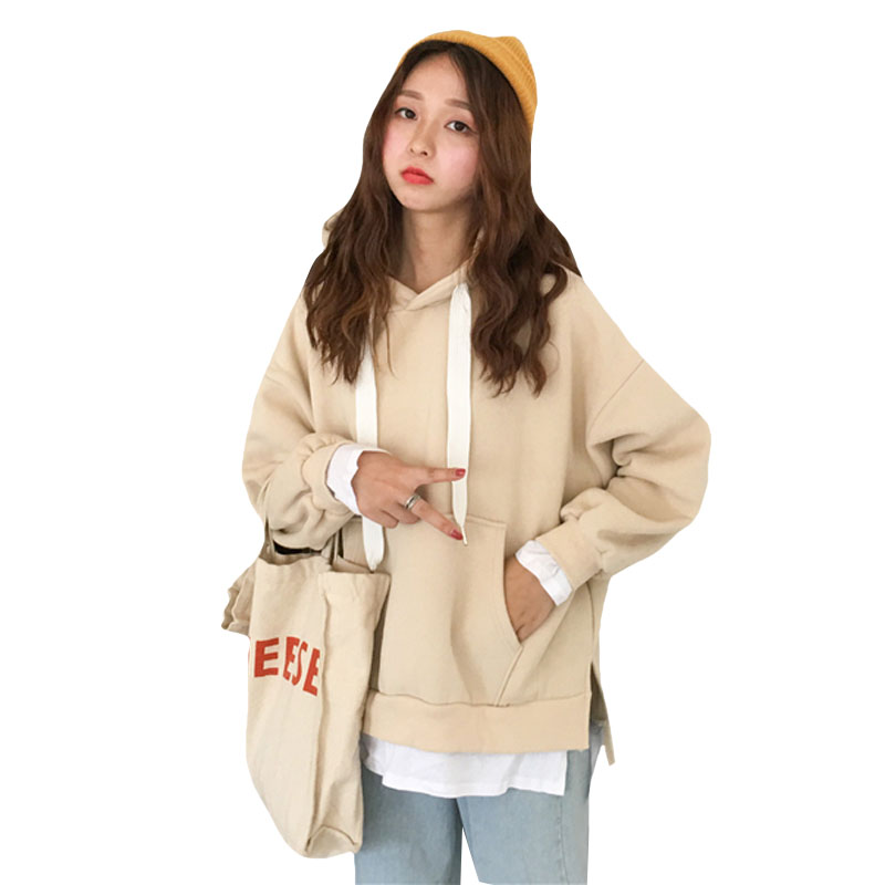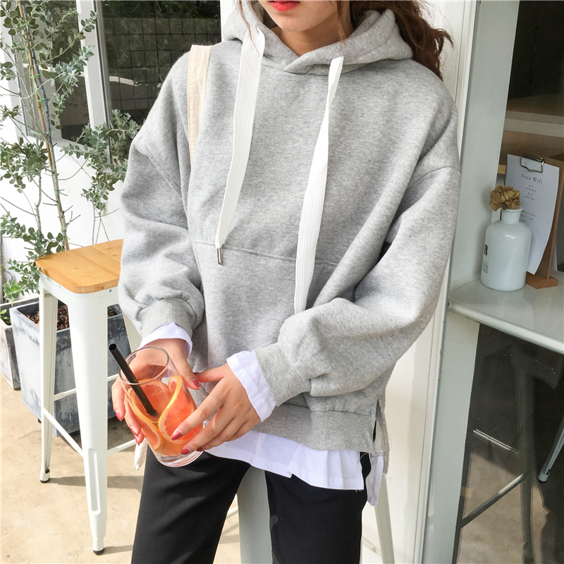 / 秋季女裝韓版中長款假兩件BF風寬松抓絨連帽套頭長袖衛衣上衣外套