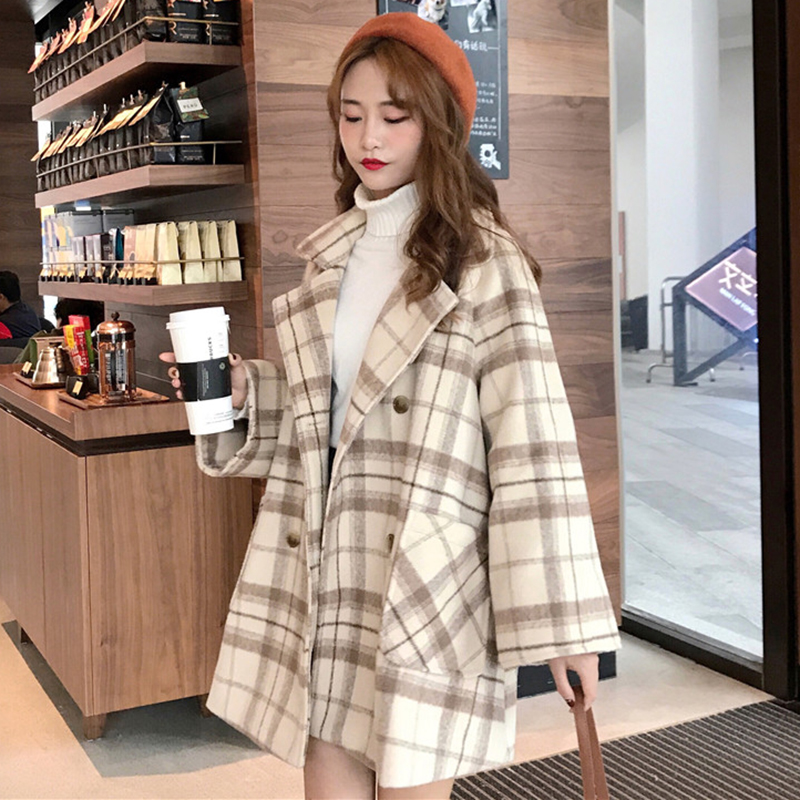 2018流行毛呢外套女秋冬裝新款赫本大衣小個子格紋風衣學院風開衫