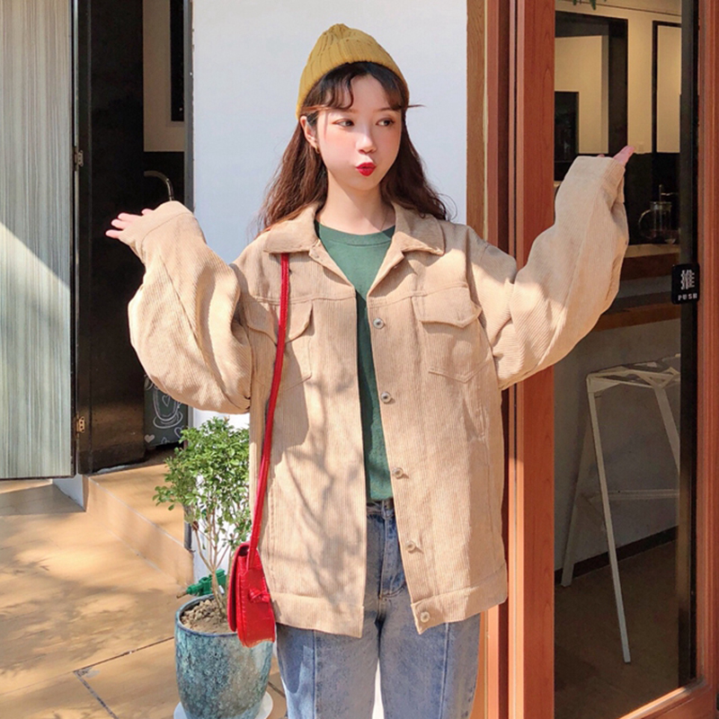 / 韓版復古風燈芯絨外套秋冬女裝2018新款學生翻領開衫休閑長袖上衣