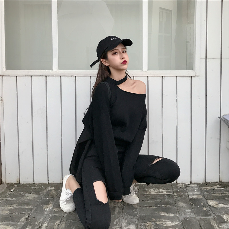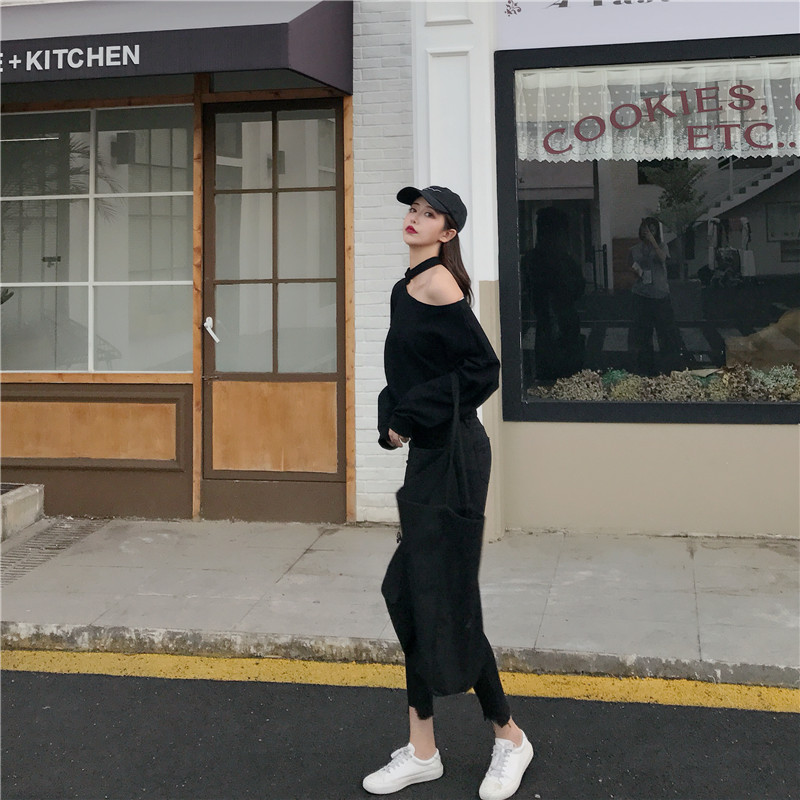 / 韓版簡約小心機斜露肩衛衣女+百搭高腰顯瘦割破牛仔小腳褲兩件套