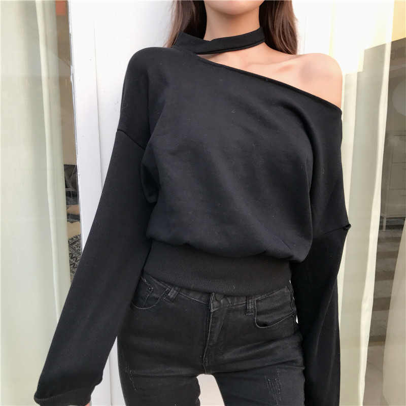 韓版簡約小心機斜露肩衛衣女+百搭高腰顯瘦割破牛仔小腳褲兩件套